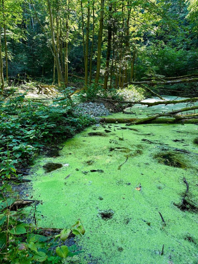 Tabliczka zdradza, że to miejsce rozrodu płazów i gadów – m.in. zaskrońca i żmii. Woda w stawach pokryta jest intensywnie zieloną rzęsą, wśród której leżą powalone drzewa. Widok jest zaskakująco malowniczy.