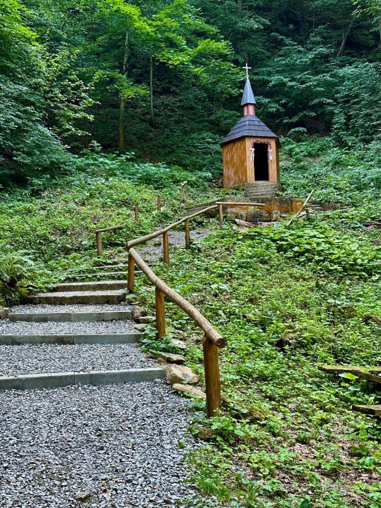 Woda z małego źródełka szemrze cicho, a za kapliczką wznosi się strome, zalesione zbocze.