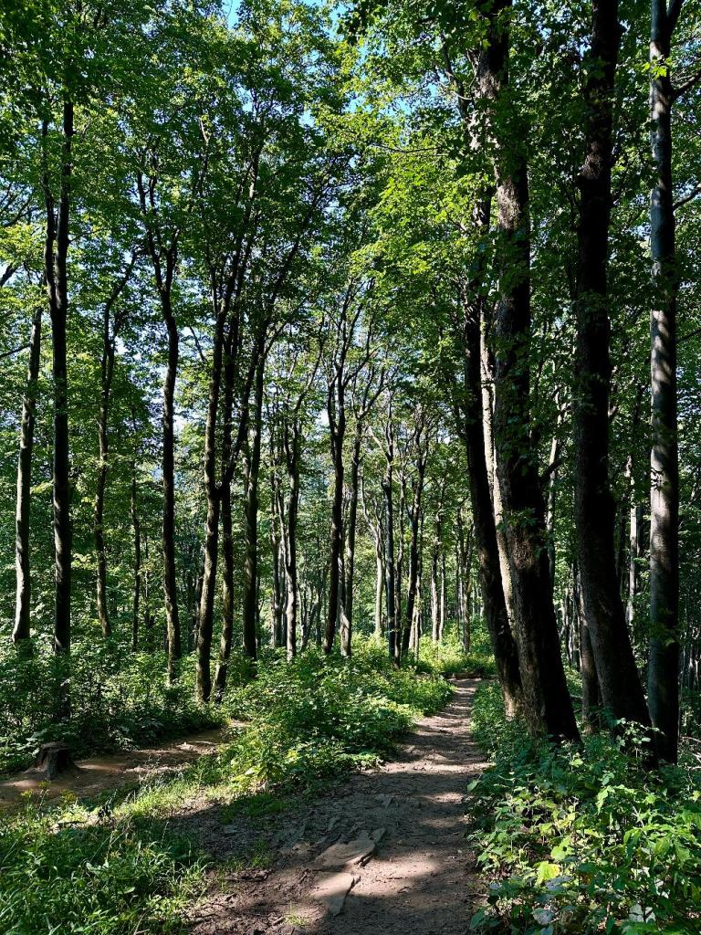 Skręcamy w wąską, wilgotną ścieżkę – żaba wyskakuje nam spod nóg, znikając w ściółce. Las zmienia się z liściastego na iglasty, mijamy wiele suchych pni. W pewnym momencie robi się duszno jak w saunie, po czym znowu wchodzimy w świeżą, zieloną gęstwinę.