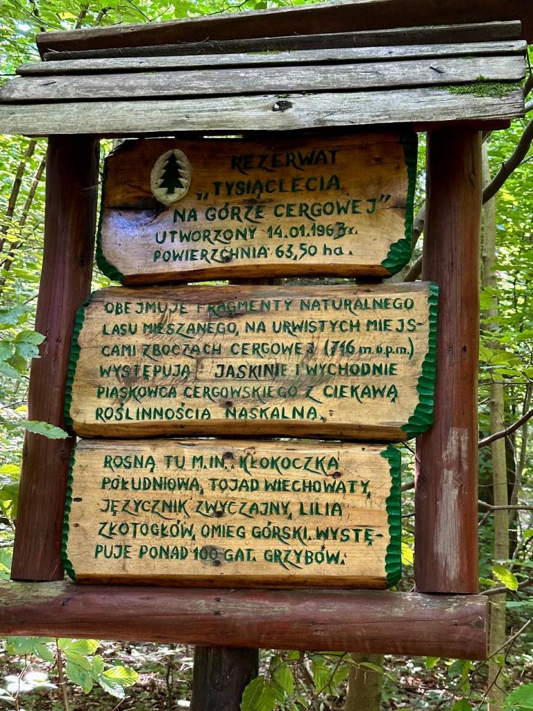 Drewniana tabliczka z wyciętymi literami wygląda jak małe dzieło sztuki. Dowiadujemy się z niej, że na Cergowej występuje ponad 100 gatunków grzybów.