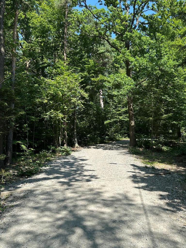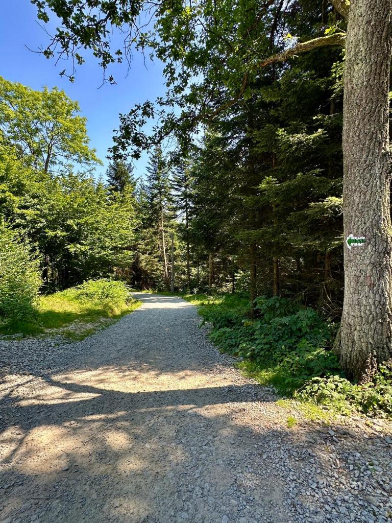 Startujemy z ostatniego parkingu pod wieżą widokową. Już na wstępie czeka na nas sporo cywilizacyjnych udogodnień – wiata, budka z lodami i goframi. Szutrowa droga najpierw lekko opada, potem łagodnie wspina się w górę. Jasnoszara, prawie biała nawierzchnia kontrastuje z soczystą zielenią drzew.