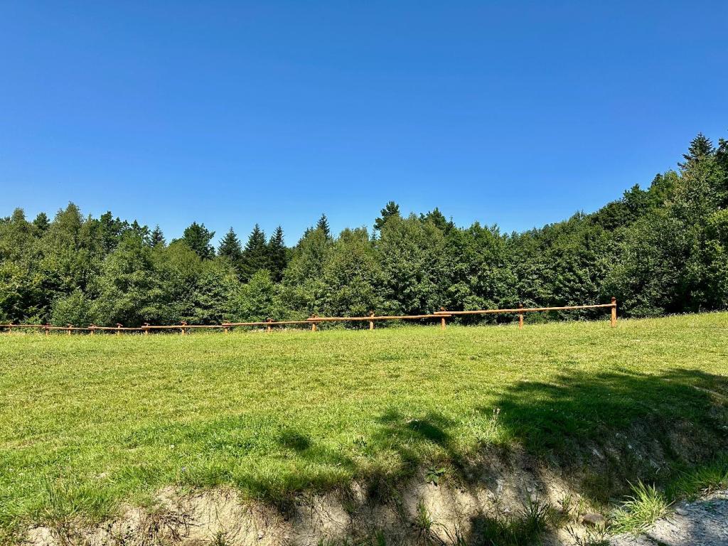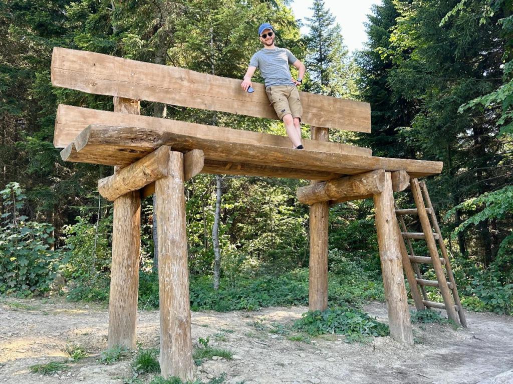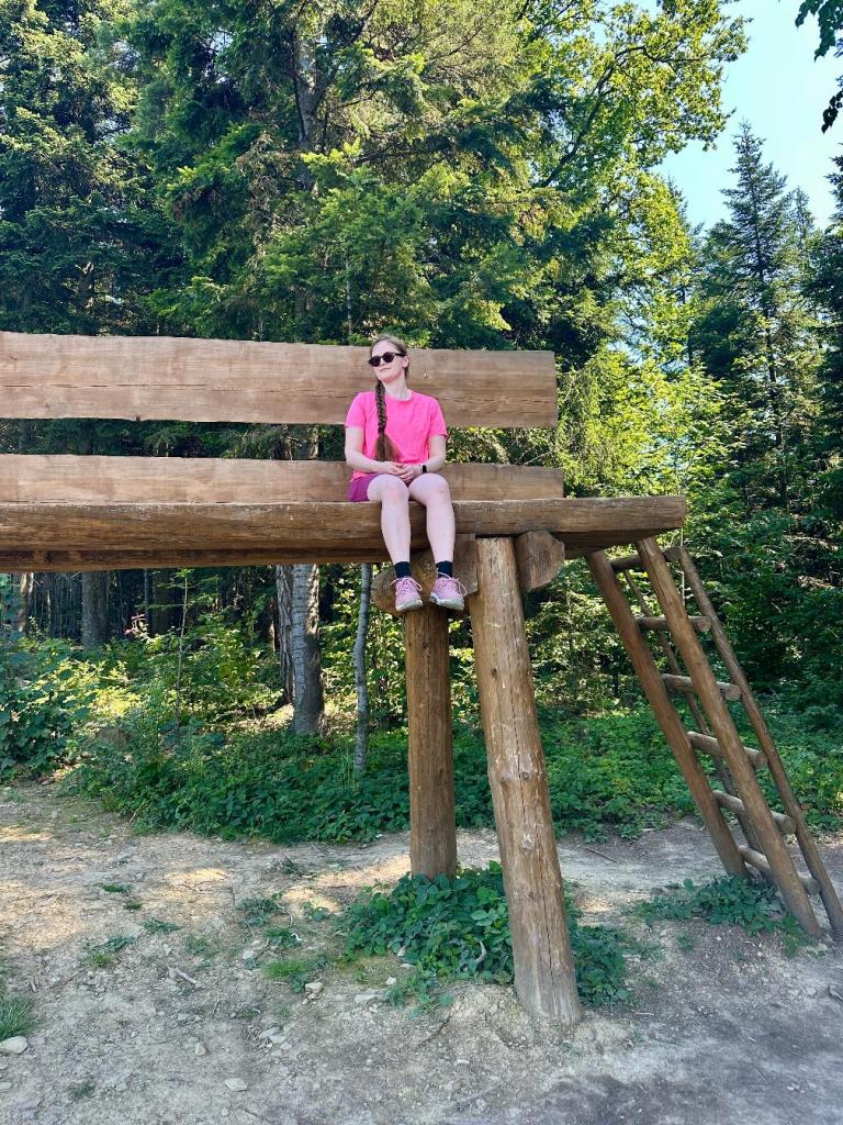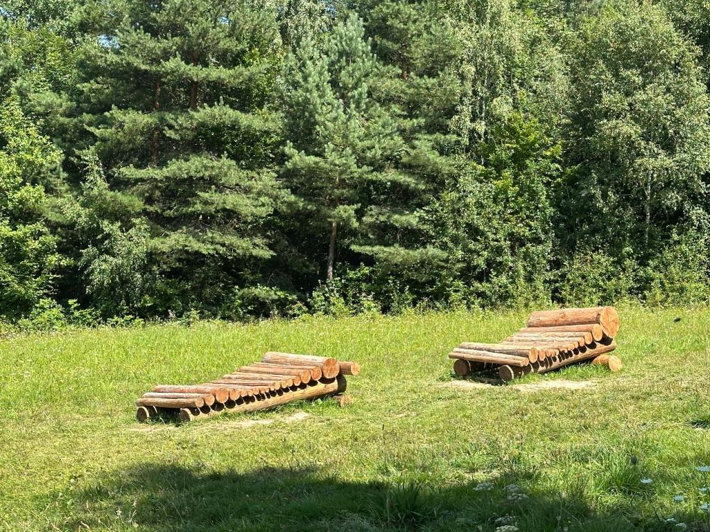 Mijamy strefę gastro – ławeczki, stoły piknikowe, budkę z miodami i jedzeniem (zapiekanki kuszą zapachem). Ładna polanka zachęca do zatrzymania się, ale mocne słońce skutecznie nas odstrasza. Idziemy dalej, mijając drewniane leżaki i wielką ławkę z drabinką.