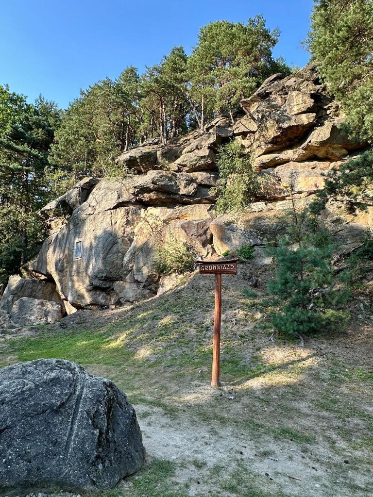Zaczynamy z parkingu. Od razu przed nami wyrasta ogromna formacja skalna Grunwald – rozłożysta, majestatyczna, z pamiątkową tabliczką.