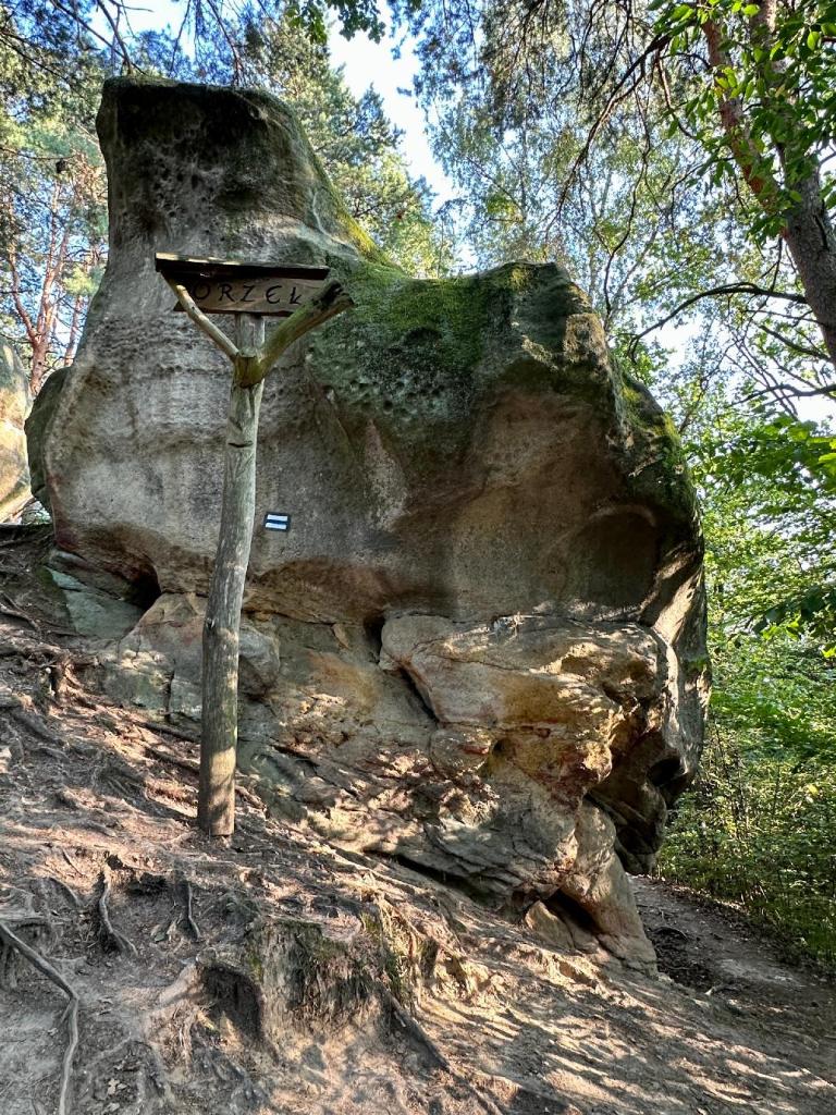 Wspinamy się pod górę po korzeniach drzew aż stajemy przed kolejną formacją. Formacja nazywa się Orzeł, ale my, mimo starań, nie potrafimy go dostrzec w układzie skał. Dopiero teraz przeglądając zdjęcia zauważyliśmy podobieństwo.