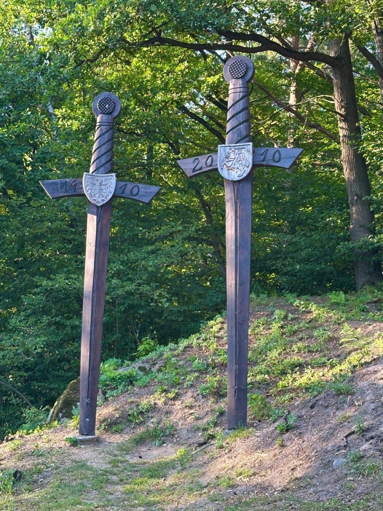 Obok wbite w ziemię dwa miecze wyglądają jak ogromne rekwizyt z filmu dla olbrzymów.