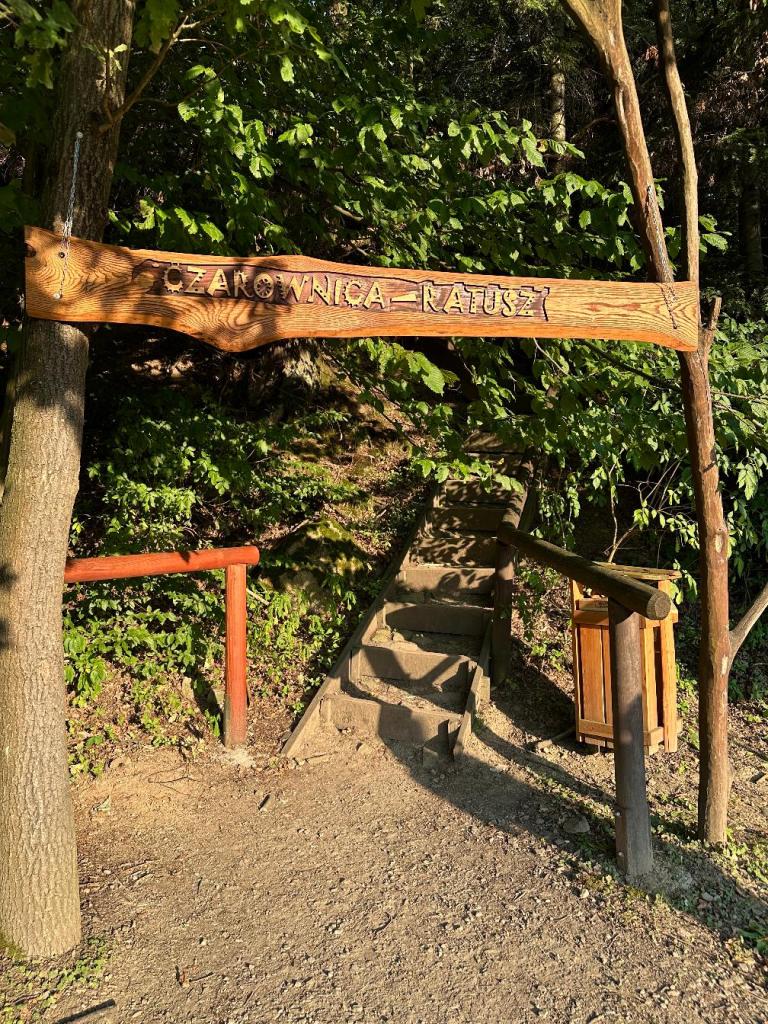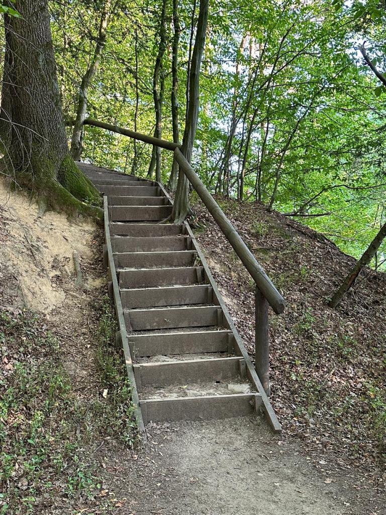 Od razu zaczynają się schody w górę, a potem kolejne. Na szczycie drewniana ławka z rzeźbionymi twarzami i tablica informująca o Szlaku Nietoperza. Nie wchodzimy dalej – jest już późno. Schodzimy po schodach, przechodzimy mostkiem nad ulicą i trafiamy na punkt widokowy Ratusz – drewniana platforma na skale.