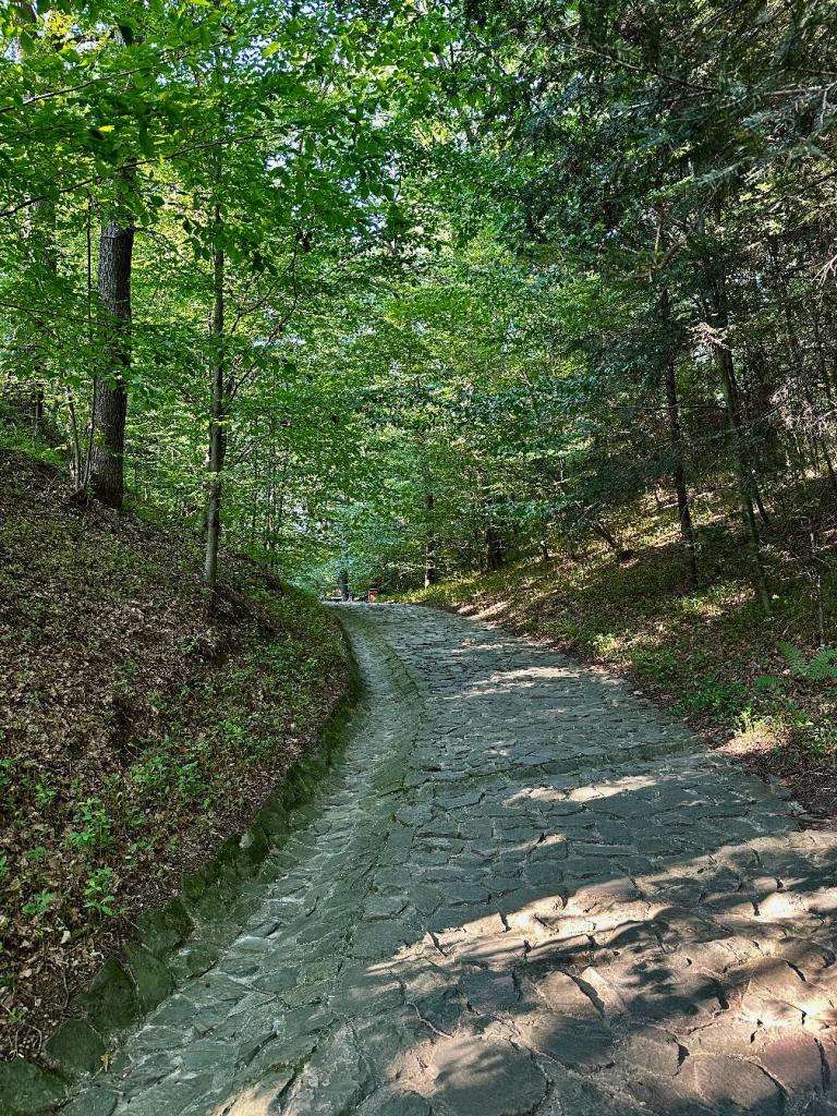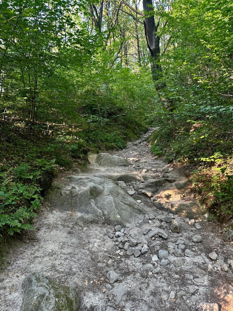 Po chwili nawierzchnia zmienia się w leśną kamienistą ścieżkę. Jest wieczór i wciąż gorąco, ale mało turystów – mamy wrażenie, że całe to miejsce jest prawie całe dla nas.