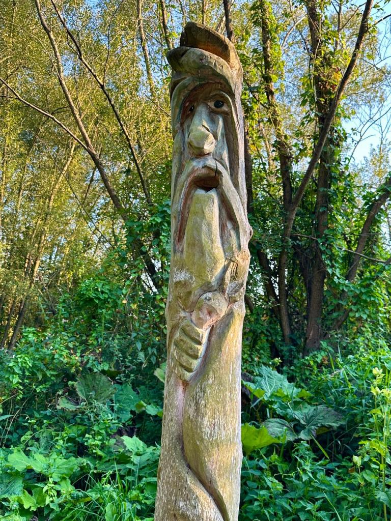 Obok niej mała łąka pachnąca kwiatami, a na niej rzeźby z drewnianych pali – twarze, ryby, to symbole kręgu żywiołów rzeki, a przynajmniej tak informuje tabliczka. Schodzimy po schodach by je obejrzeć z bliska. Powietrze jest ciepłe i słodkie od zapachu roślin.