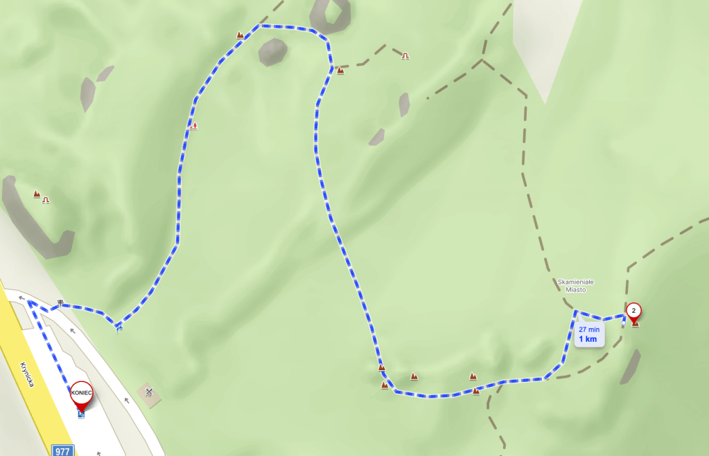 Trasa: Parking – Kasa biletowa – Podążamy za oznaczeniami szlaku niebieskiego. Uwaga! Do kolejnych formacji skalny może prowadzić więcej niż jedna droga, podobnie można oglądać formacje skalne z różnych stron. – Dochodzimy do formacji skalnej “Borsuk” i wracamy tą samą drogą do parkingu – Udajemy się do początku parkingu gdzie przechodzimy przez bramę z napisem “Ratusz Czarownica” i idziemy schodkami w górę – Na skrzyżowaniu skręcamy w prawo i przechodzimy przez stalowy mostek nad jezdnią – Za mostkiem idziemy prosto na punk widokowy – Wracamy do mostku i skręcamy w prawo schodkami w dół – Idziemy chodnikiem aż do schodków w dół – Łąka pod skałą Czarownicy – Wracam do parkingu (można tą samą drogą lub wzdłuż jezdni) – Parking