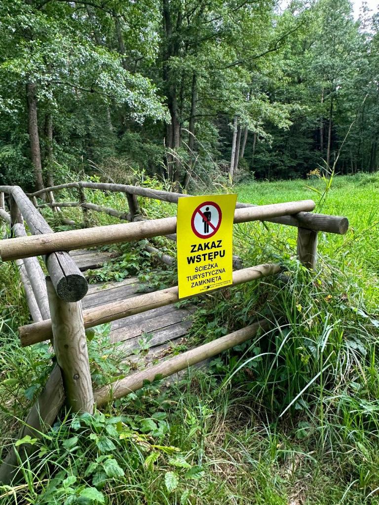 Wchodzimy w las, szybko docieramy do mostku. Tabliczka ostrzega, że trasa jest zamknięta – konstrukcja rozpada się i nie pozwala zrobić pętli. Mżawka wisi w powietrzu, krople cicho stukają o kaptur. Zamiast iść mostkiem w lew, skręcamy w prawo na inny mostek.