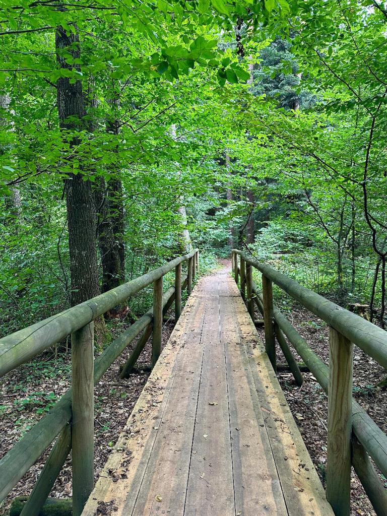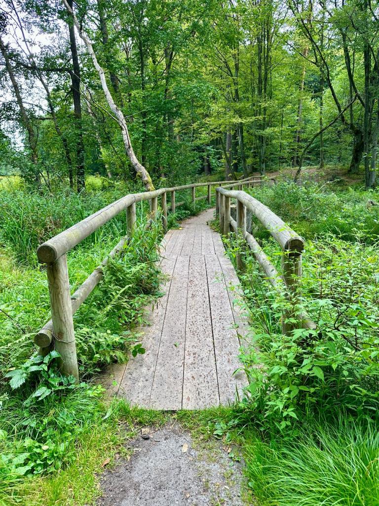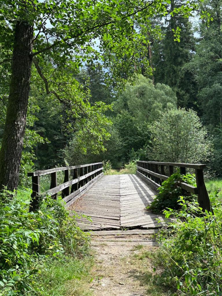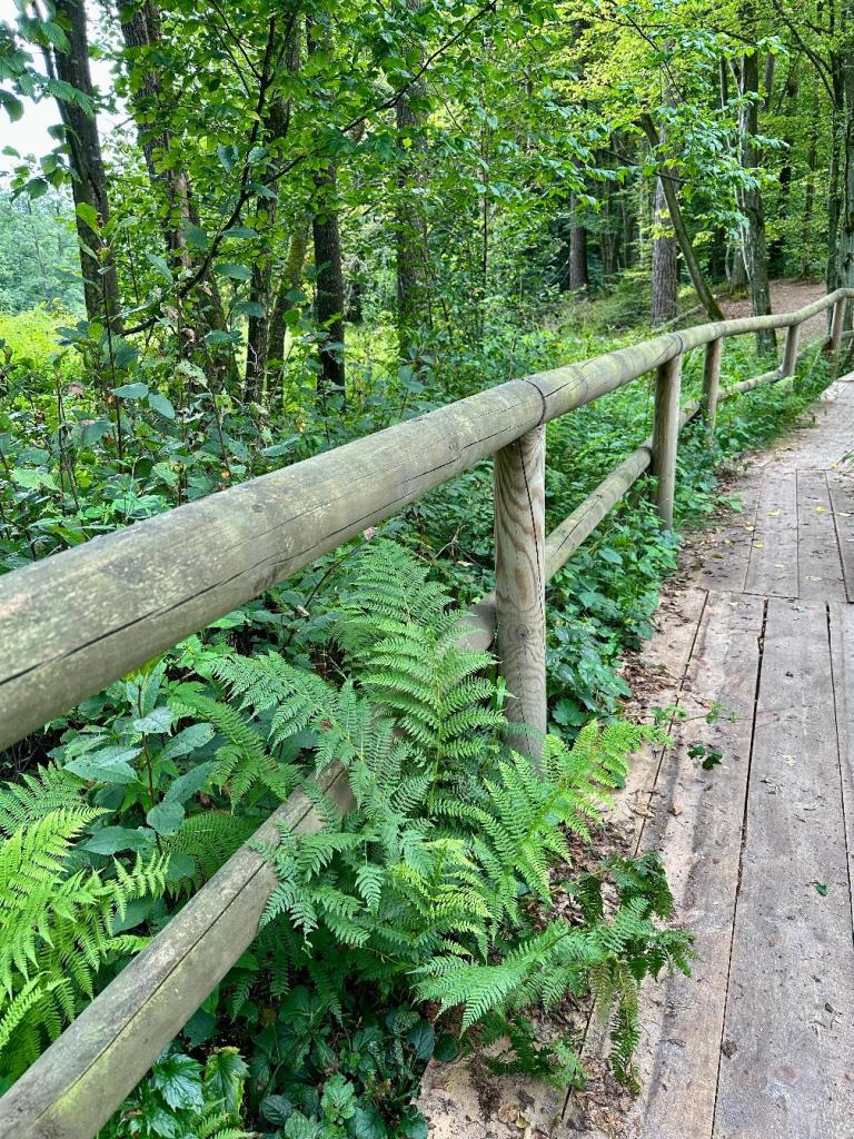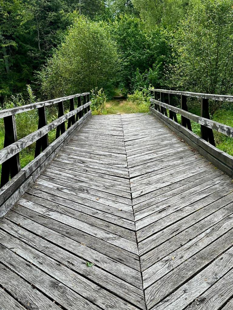 Mostek przed nami prowadzi nad brunatną rzeką, otoczoną soczystą zielenią. Na brzegach – paprocie i omszałe pnie, pachnące wilgocią.