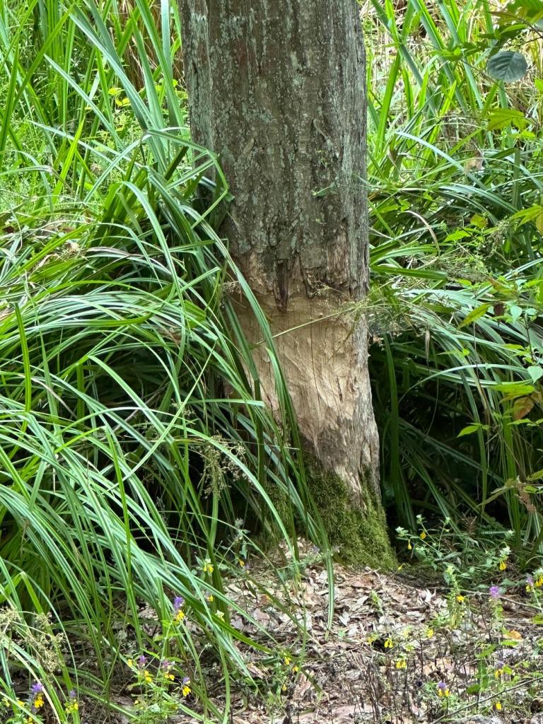 Przez chwilę idziemy w rytmie stukotu butów po mokrych deskach. Tuż za mostkiem kolejne drzewa podgryzione przez bobry i następna kładka.