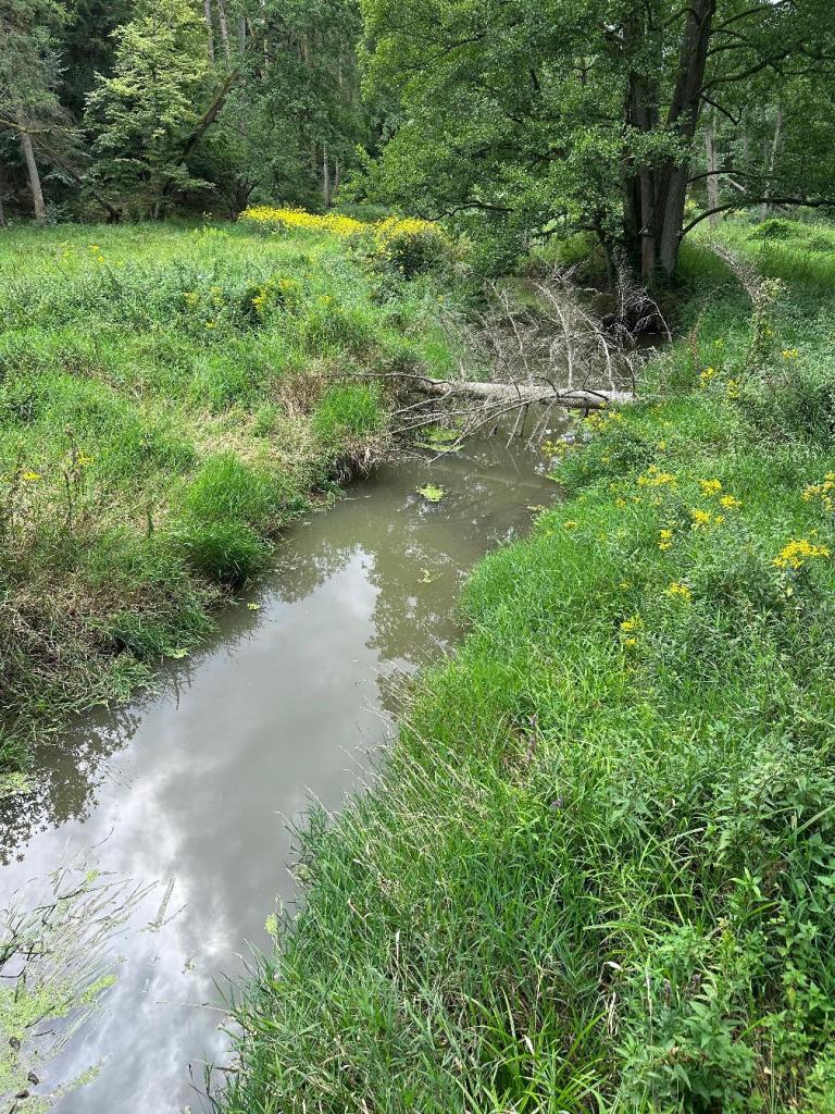 Mijamy sztuczny kanał otoczony kwiatami polnymi. Po prawej przebija żółć kwiatów rosnących przy rzece. Stare drzewa mają pofalowaną korę, miejscami obrośniętą mchem.