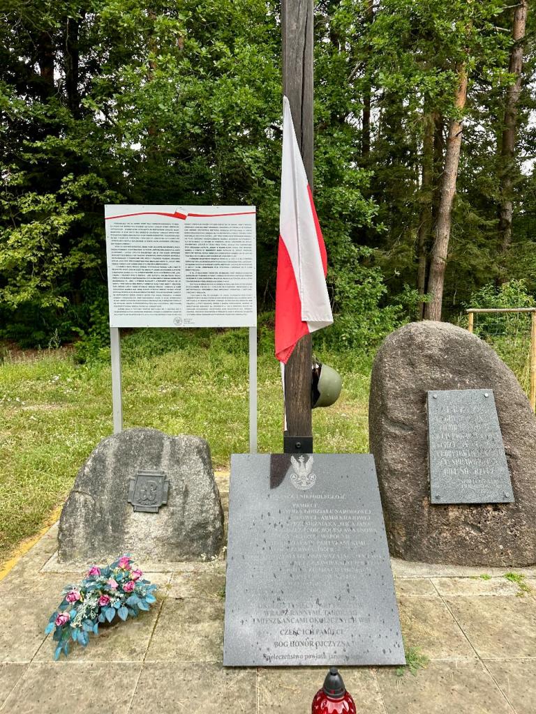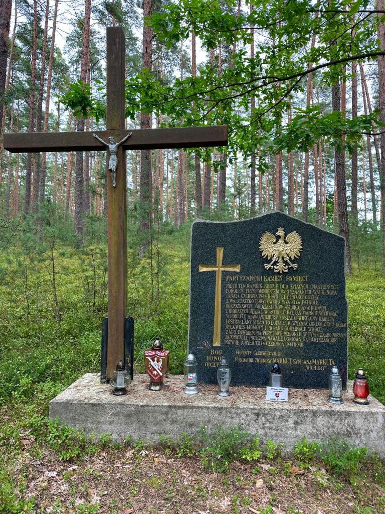 Odbijamy w piaszczystą drogę. Pojawiają się wydmowe struktury, a między drzewami dostrzegamy partyzancki kamień pamięci.