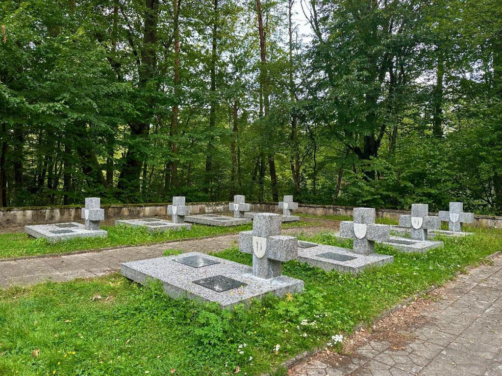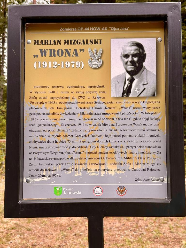 Kawałek dalej znajdujemy tabliczki, które opisują losy partyzantów z oddziału „Ojca Jana”. Zatrzymujemy się przy pomniku poświęconym ich pamięci, a zaraz za nim oglądamy cmentarz wojskowy.