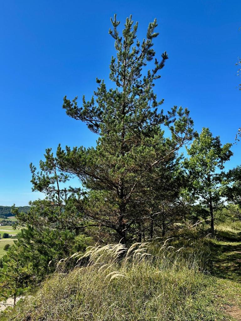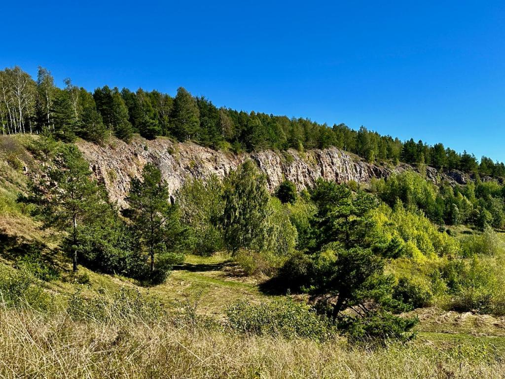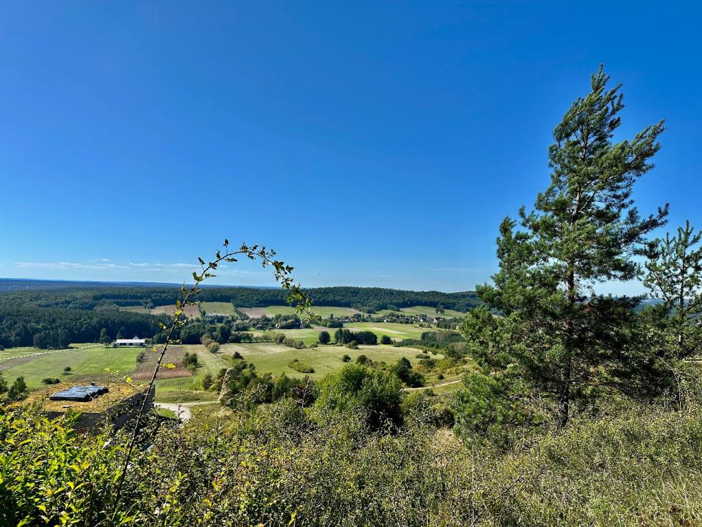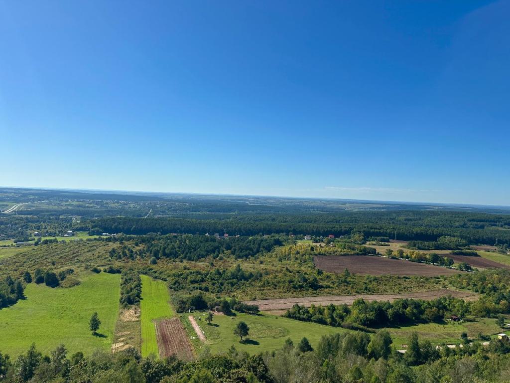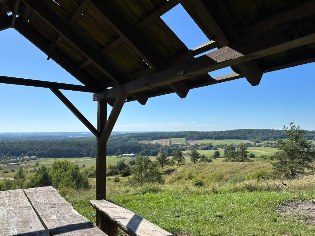 Po kilkunastu minutach dotarliśmy na szczyt. Widok na okoliczne wioski i pola był szeroki, choć palące południowe słońce mocno dawało się we znaki. Brzozy szumiały na wietrze i gubiły pierwsze liście, w powietrzu czuć było zapach wczesnej jesieni. Tabliczki informowały o szlaku geologiczno-archeologicznym i dawnym kamieniołomie.