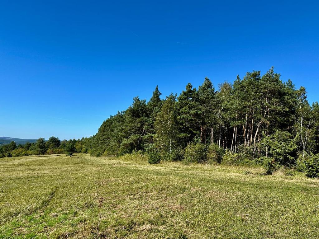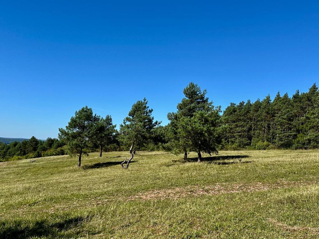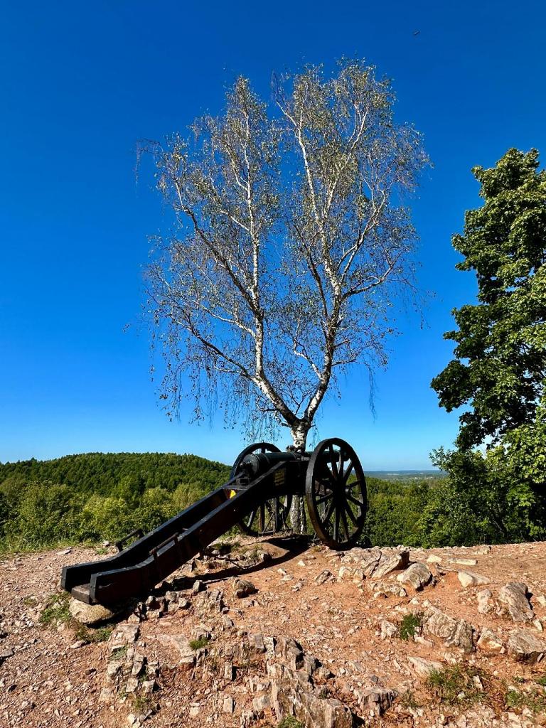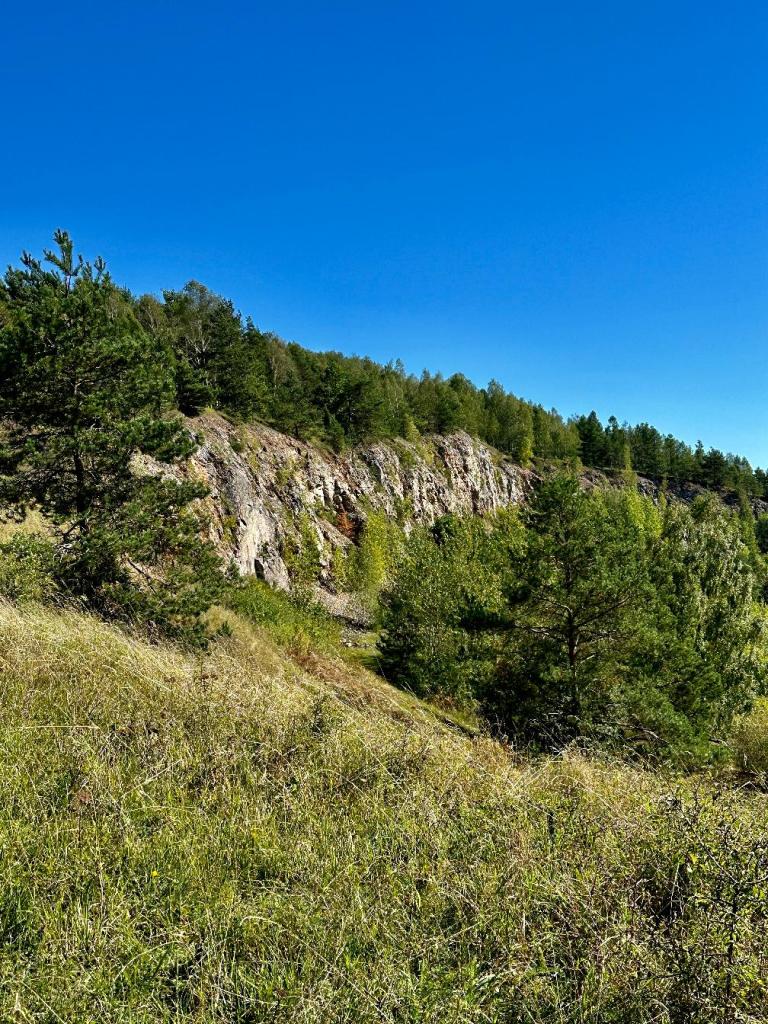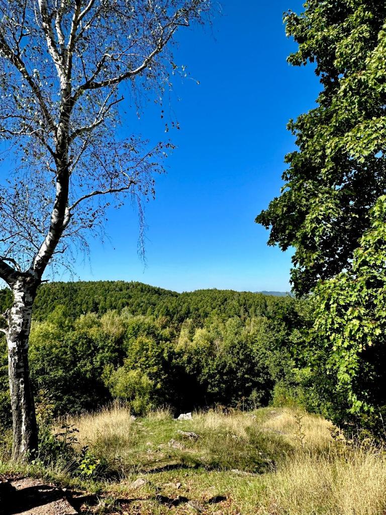Po kilkunastu minutach dotarliśmy na szczyt. Widok na okoliczne wioski i pola był szeroki, choć palące południowe słońce mocno dawało się we znaki. Brzozy szumiały na wietrze i gubiły pierwsze liście, w powietrzu czuć było zapach wczesnej jesieni. Tabliczki informowały o szlaku geologiczno-archeologicznym i dawnym kamieniołomie.