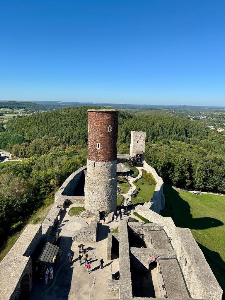 Zwiedzaliśmy górny i dolny zamek. Tablice informacyjne i ekspozycje opowiadały o historii, m.in. o sądownictwie i dawnych torturach. Zatrzymaliśmy się przy studni – elegancko zabudowanej, dającej trochę cienia, choć wciąż była to po prostu głęboka dziura w ziemi. W jednej z sal oglądaliśmy reprodukcje obrazów i archiwalne zapiski o Chęcinach.