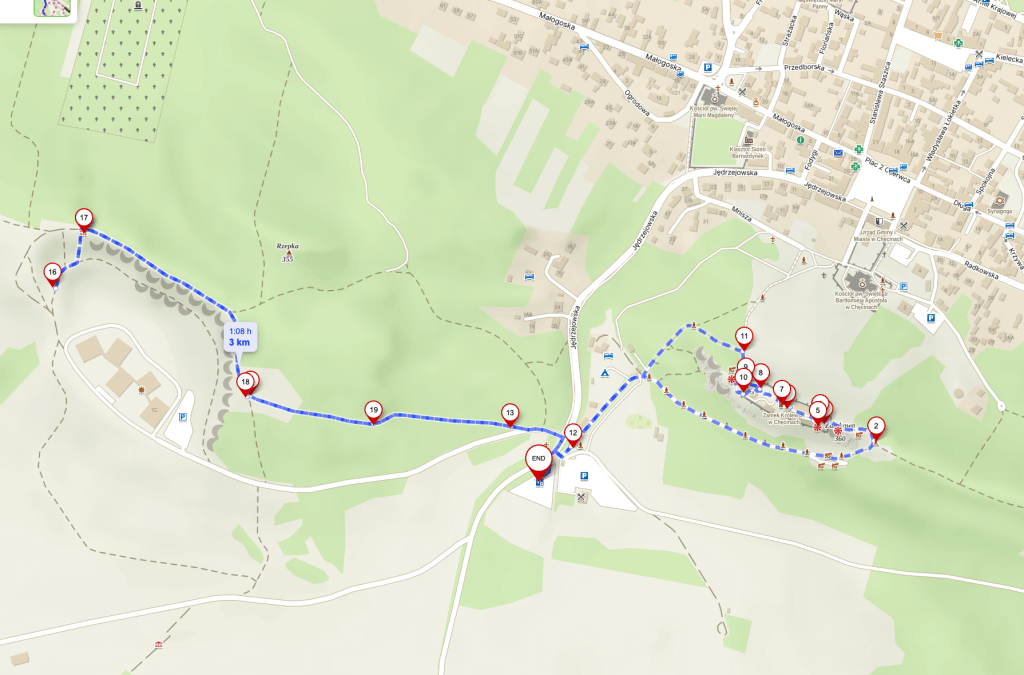 Trasa: Parking – Kierujemy się alejką w stronę zamku – Przy tabliczce z toaletą skręcamy w prawo – Mijamy kasę biletową i przechodzimy przez główną bramę zamku – W środku zamku nie ma ustalonej trasy zwiedzania a wyjście znajduje się na przeciwległym końcu – Schodźmy w dół i na pierwszym skrzyżowaniu skręcamy w lewo – Docieramy do parkingu i przechodzimy na drugą stronę jezdni na drogę wyłożona kostką brukową – Idziemy dalej prosto w miejscu gdzie szlak czarny odbija w bok – Skręcamy w następną ścieżkę w prawo – Kierujemy się cały czas drogą nad skarpą – Dochodzimy do wiary turystycznej – Wracamy tą samą drogą – Parking