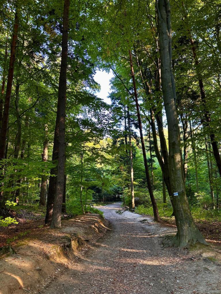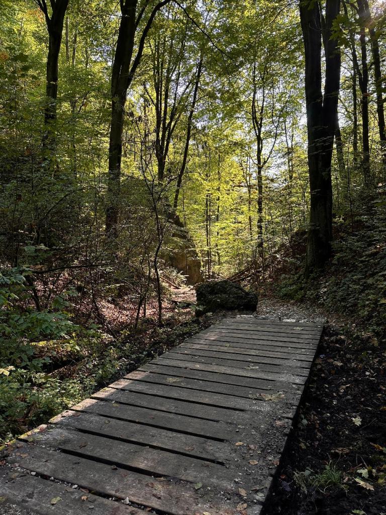 Zielony szlak łączy się z dydaktyczną ścieżką. Zaczyna się wspinaczka – schody, ścieżki w górę, a wokół coraz więcej brązowych liści na ściółce. Tabliczki informują o hibernacji nietoperzy – natura przygotowuje się do zimy.