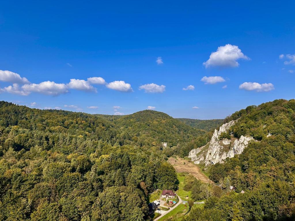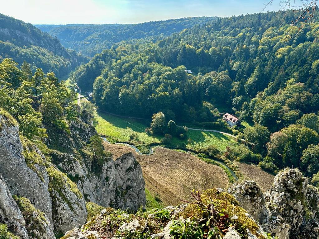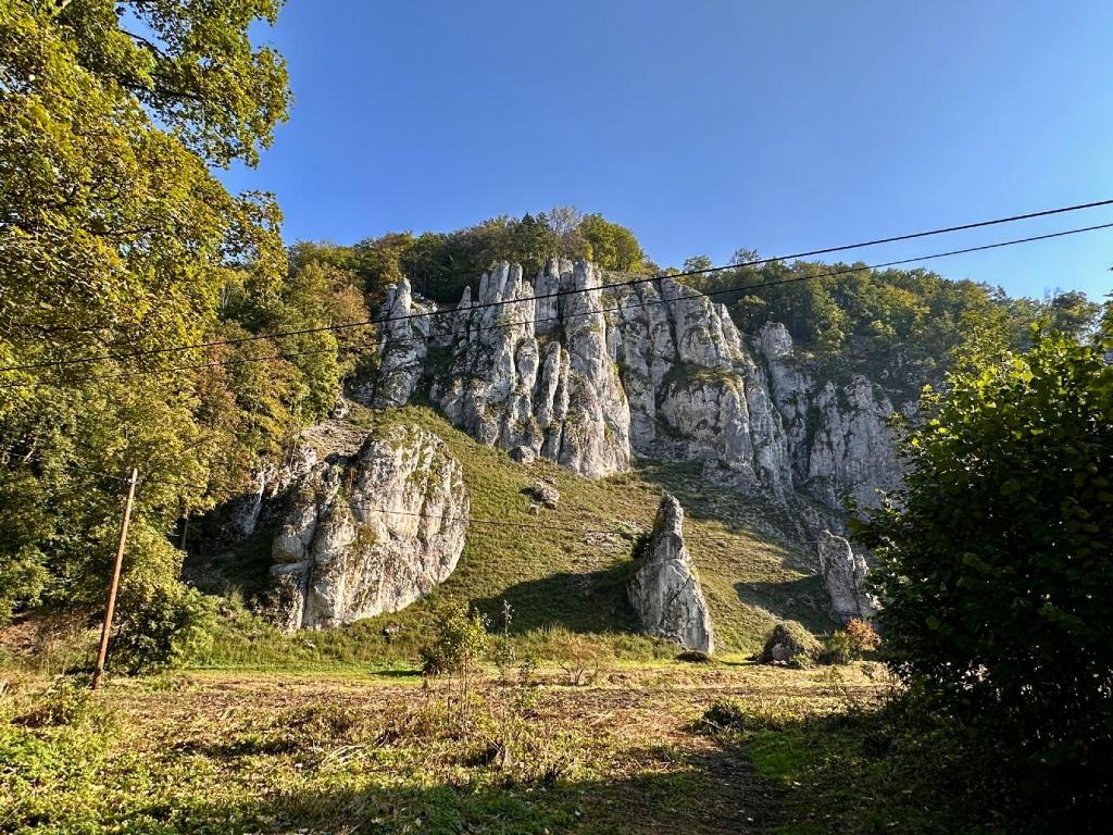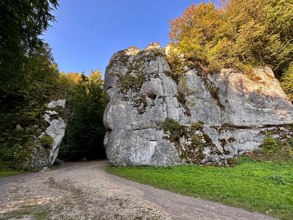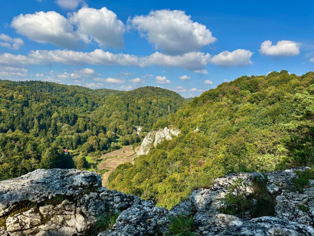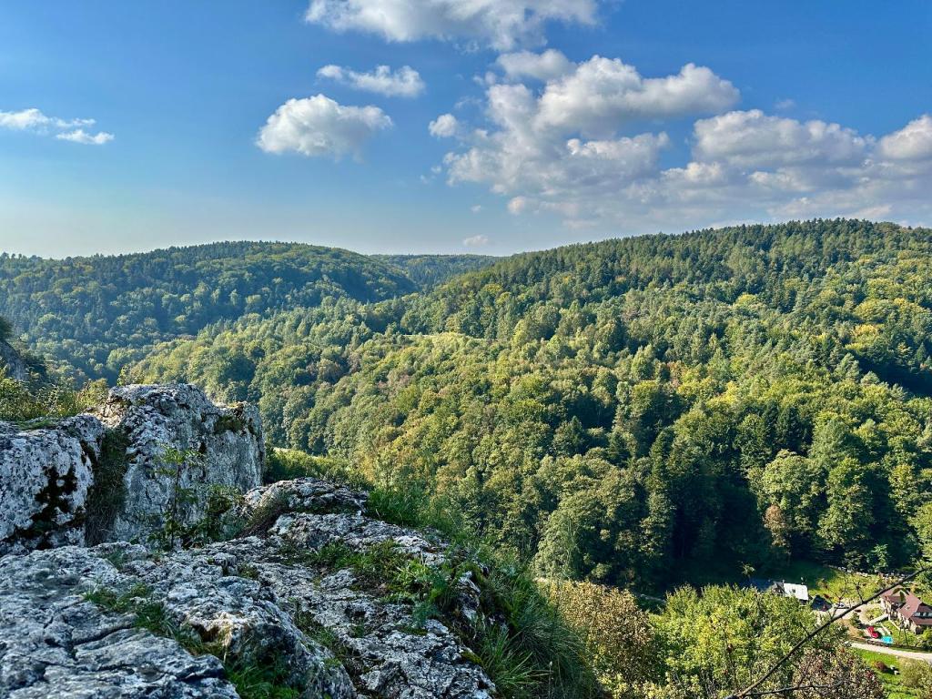 Brama Krakowska faktycznie wygląda jak monumentalna kamienna brama. Jej wyszczerbienia i naturalne kształty robią niesamowite wrażenie. Po drugiej stronie doliny widać białe skały, na których trzymają się drzewa – kontrast między kamieniem a zielenią jest zachwycający.