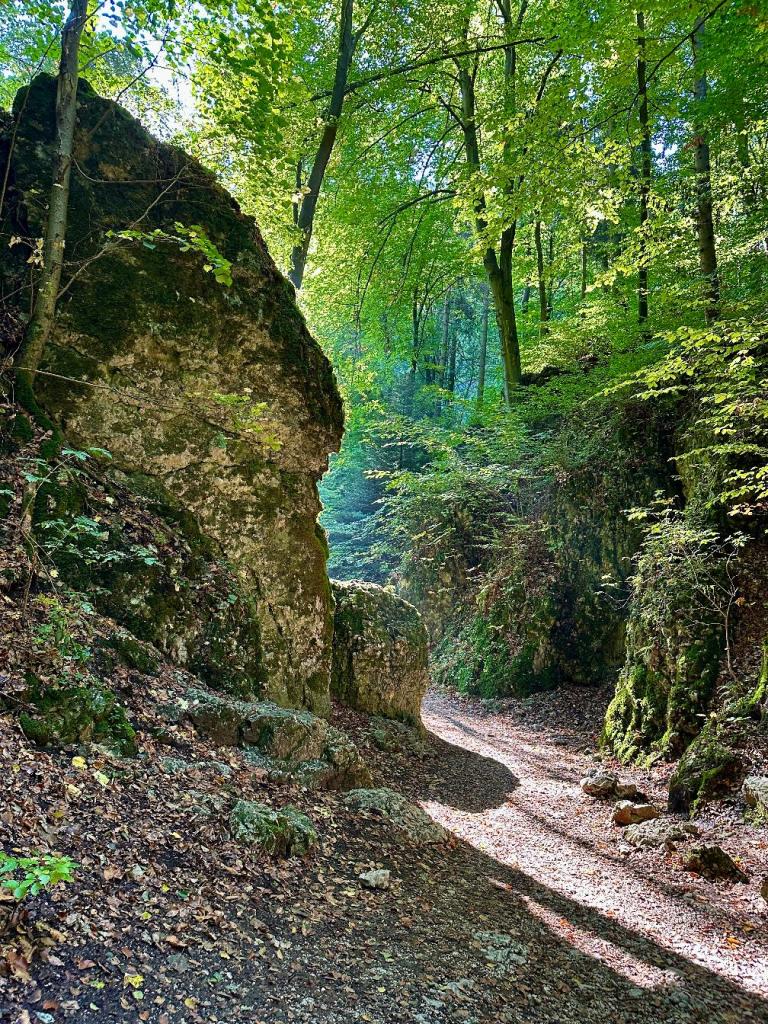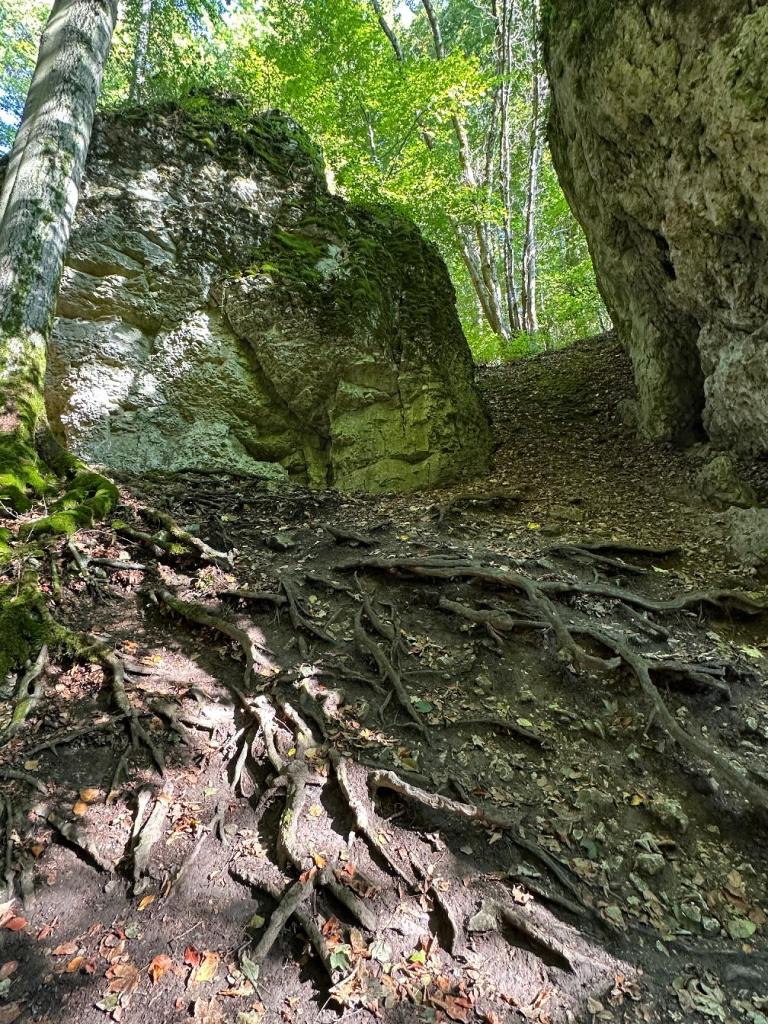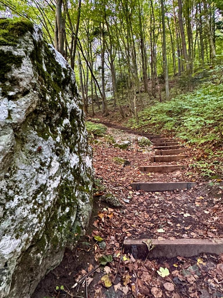 Idziemy w dół niebieskim szlakiem. Schody i śliskie, kamieniste fragmenty sprawiają, że trzeba patrzeć pod nogi. Wokół zaczynają wyrastać pierwsze formacje skalne – ogromne, jasne głazy, porowate i obrośnięte mchem.