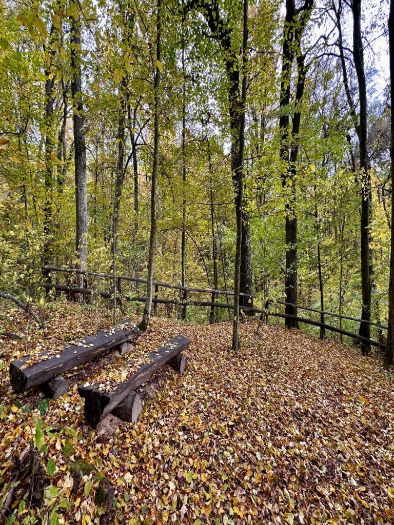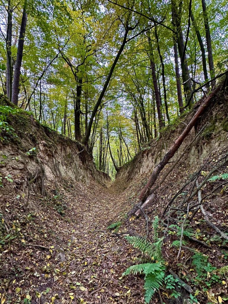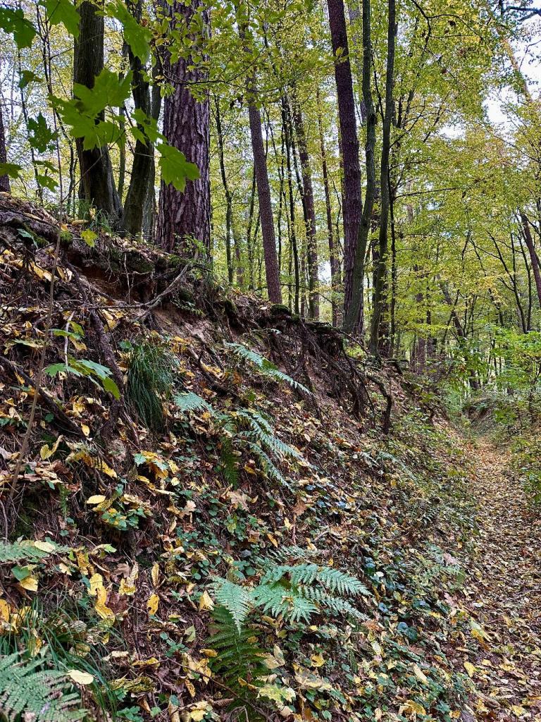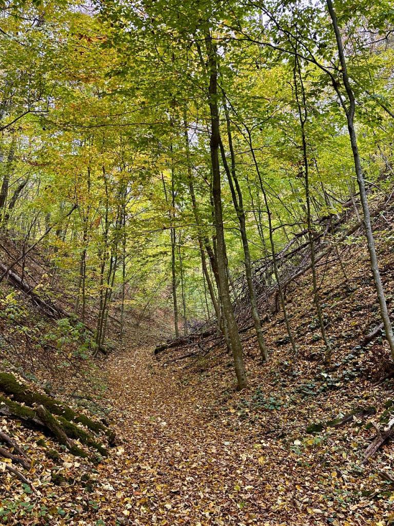 Na punkcie widokowym stoją ławeczki i drewniane barierki. Wąwóz w dole jest gęsto porośnięty – jego kształt zlewa się z zielenią, żółcią i brązem. Wracamy na ścieżkę, mijamy połamane drzewa, schodzimy w dół.