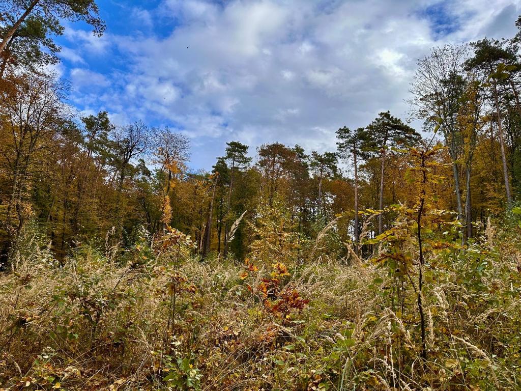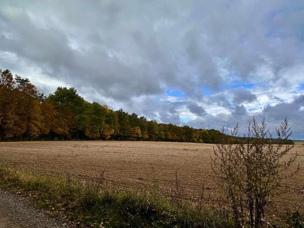 Na miejscu przywitał nas mały parking, a obok zaorane pole. Wiało, a w powietrzu czuć było wilgoć. Las mienił się żółcią, liście szumiały i szeleściły pod butami.
