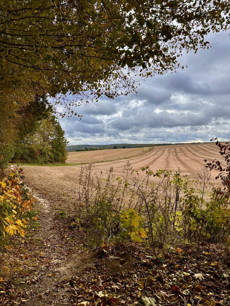 Za drzewami widać już pola. Przygotowane na zimę, zaorane, brązowo szare. To skraj lasu i drugie wejście na ścieżkę. Dla nas to połowa drogi, ponieważ robimy pętlę.