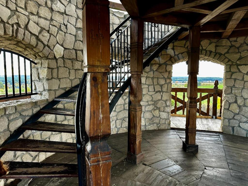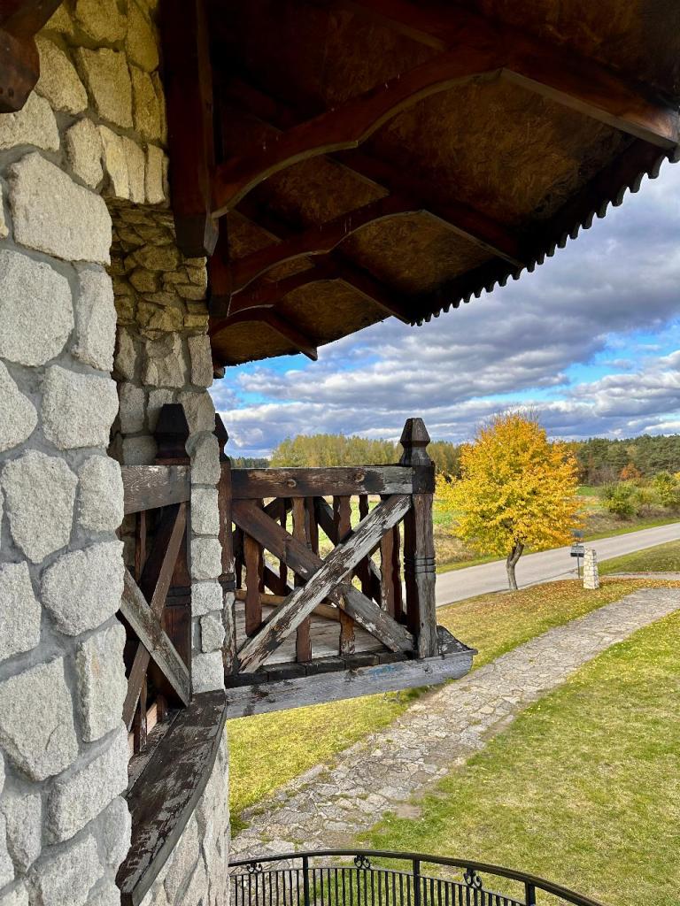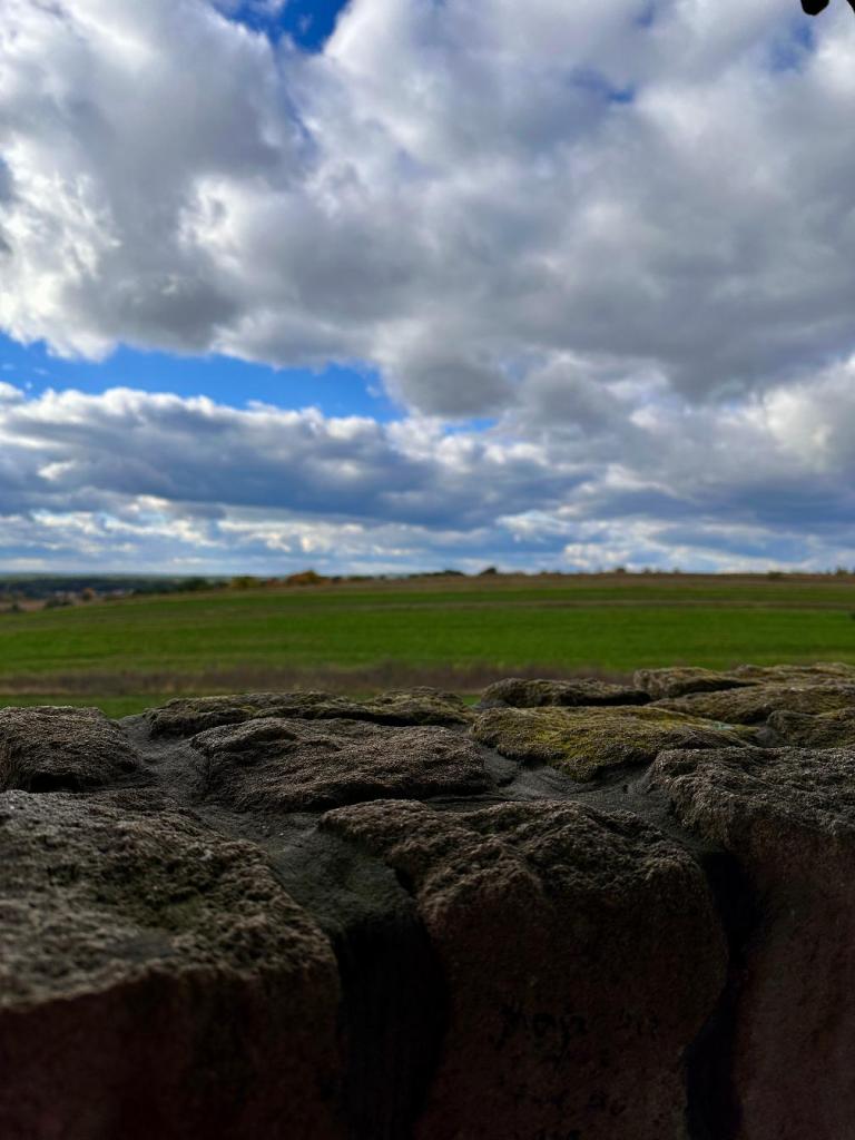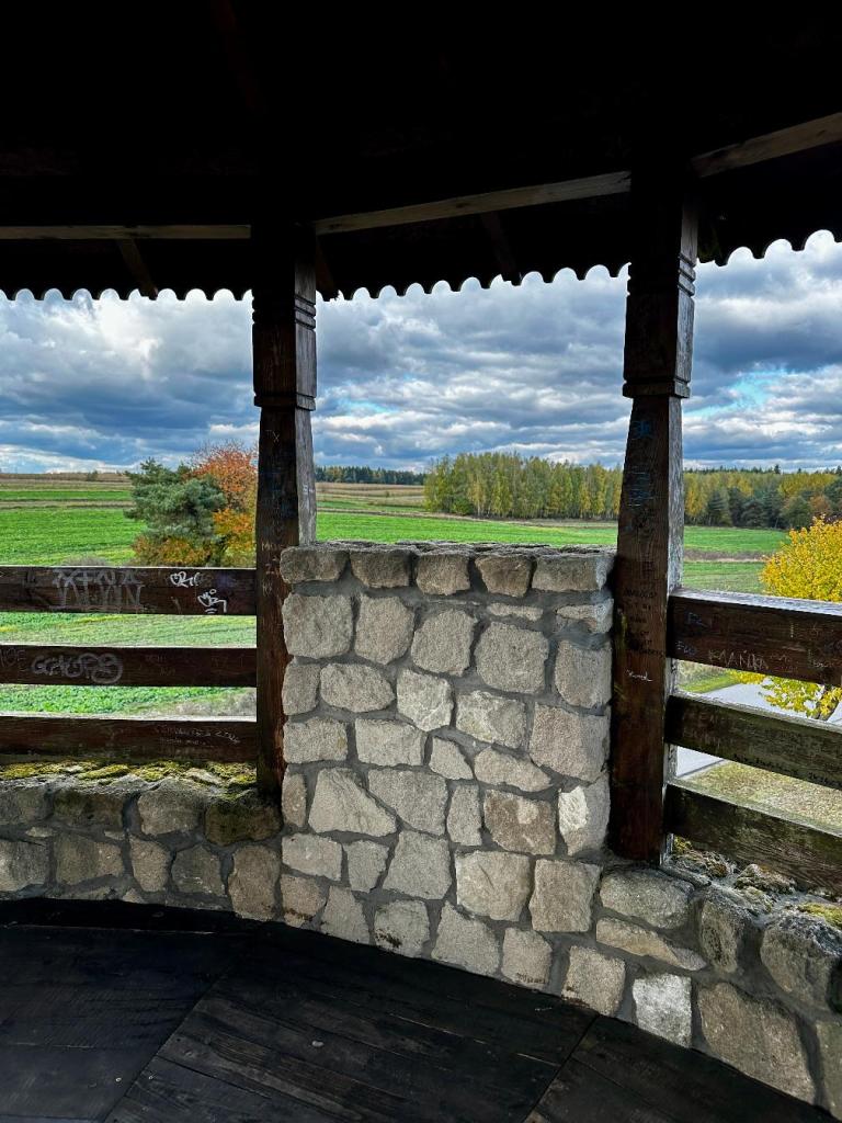 Ma dwa poziomy – na dolnym znajduje się taras, z którego można spojrzeć na pola i drogę biegnącą w oddali. Widok może nie tak spektakularny jak z wysokich gór, ale ma w sobie coś prostego i prawdziwego.