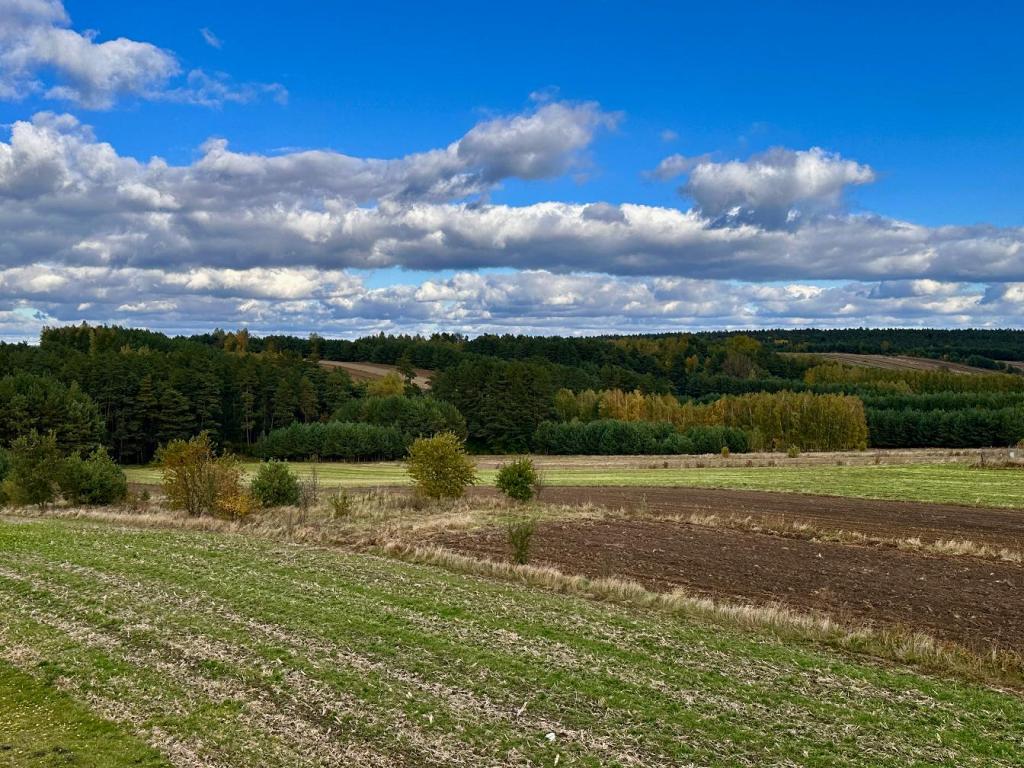 - Widok na szerokie pola i linię lasu w oddali