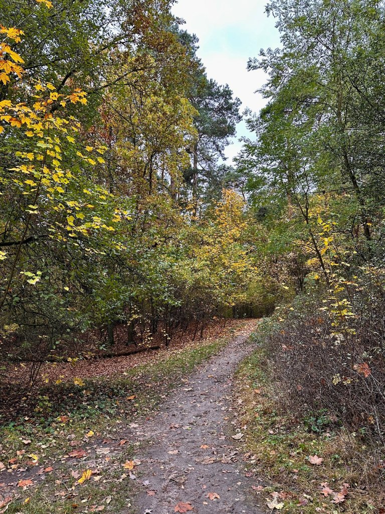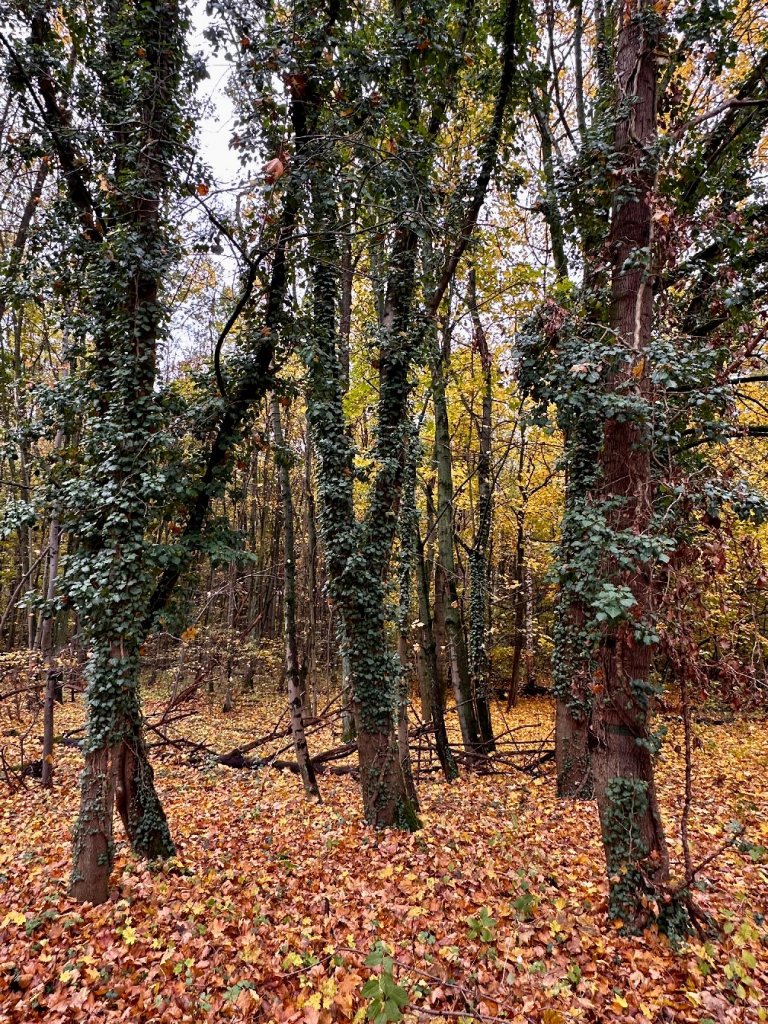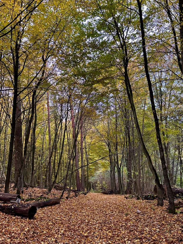Po chwili zanurzamy się w wąską, leśną ścieżkę. Wokół żółte liście wirują na wietrze, a drzewa porośnięte bluszczem wyglądają jak z jesiennej baśni.