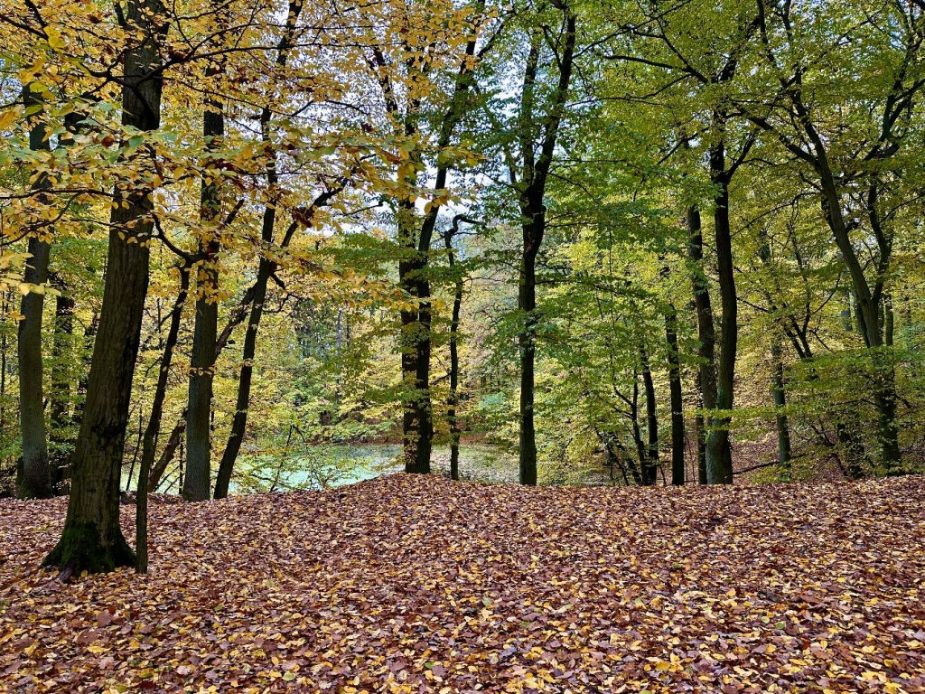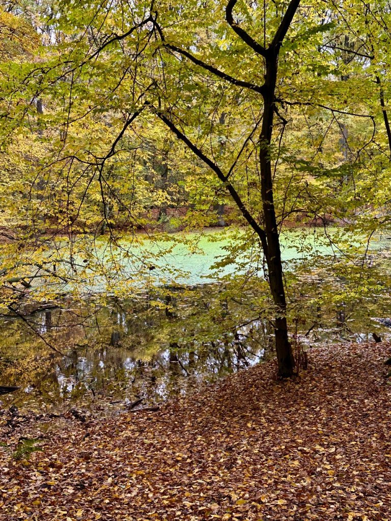 Przystajemy i oglądamy jeziorko położone w dole lasu, otoczone złotem liści i zielonkawą rzęsą. Woda faluje delikatnie przy brzegu, gdzie jest bardziej przejrzysta.