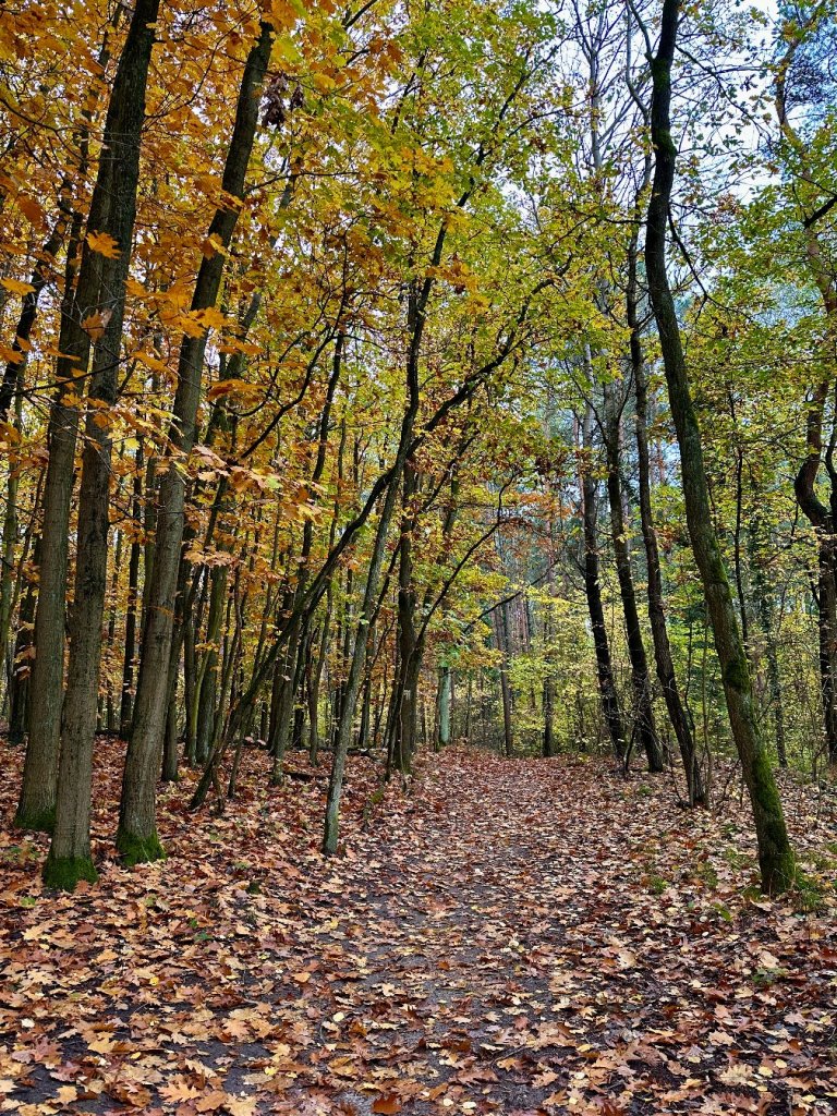 Żółty dywan liści prowadzi nas w głąb lasu.