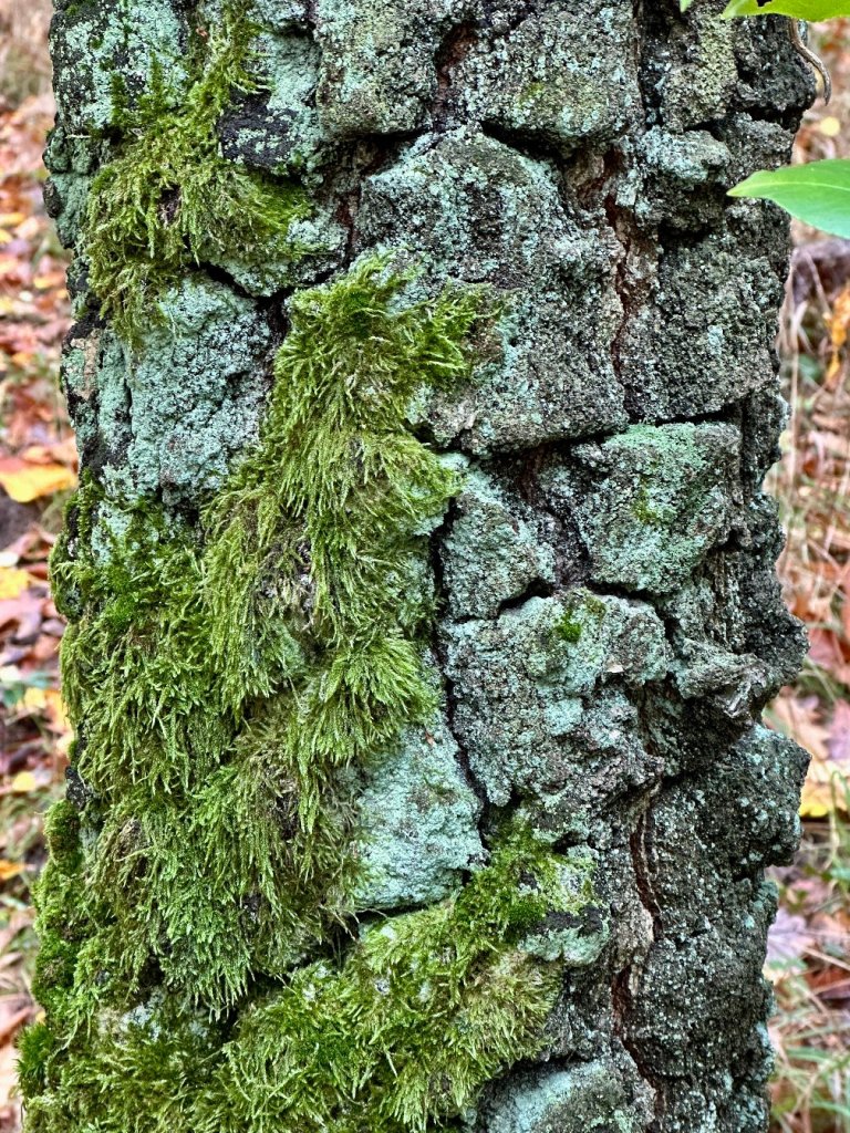 Szlak rozwidla się, a oznaczenia są coraz rzadsze. Idziemy lekko pod górę, mijając omszałe pnie brzóz, potem znowu w dół, i znów pod górę, tym razem dosyć stromo.