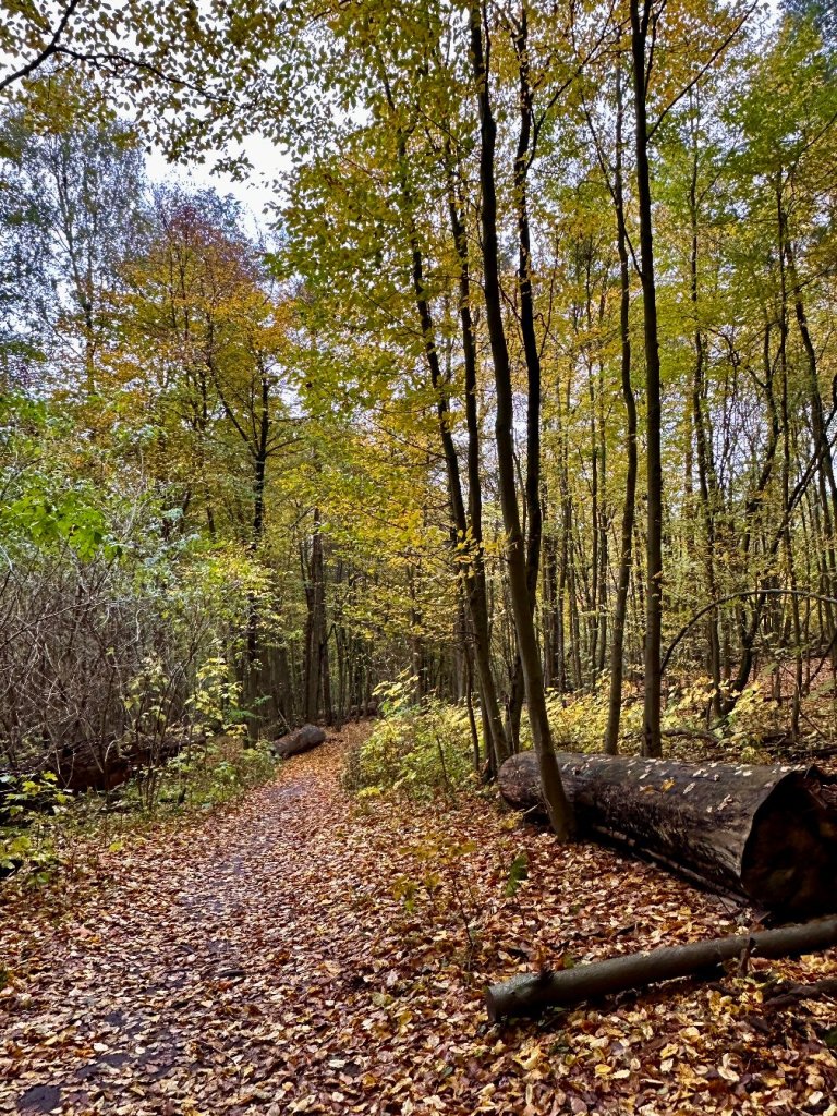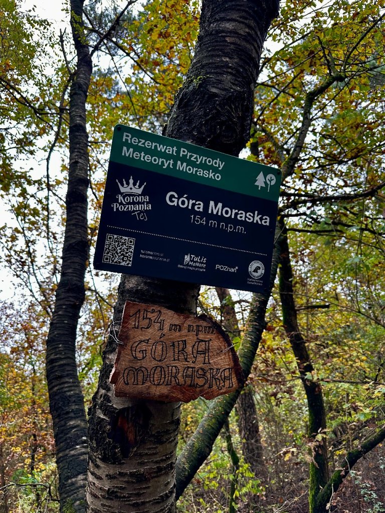 Po spacerze nad Jeziorem Góreckim ruszamy dalej, tym razem w stronę Rezerwatu Meteoryt Morasko. Dzień jest chłodny, ciemny i mokry, z niskimi chmurami wiszącymi nad drzewami. To końcówka października, deszcz padał całą noc, a las wita nas szumem wiatru i zapachem mokrych liści.