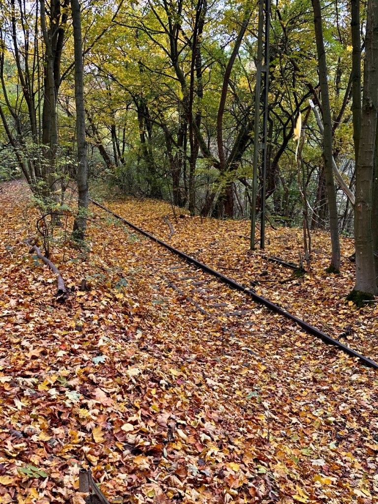 Szlak odbija w stronę strzałki z napisem „Kolej drezynowa”. Wchodzimy w wąwóz, z którego wyłaniają się stare tory kolejowe i zawalona, ogrodzona stacja – resztki dawnych czasów.