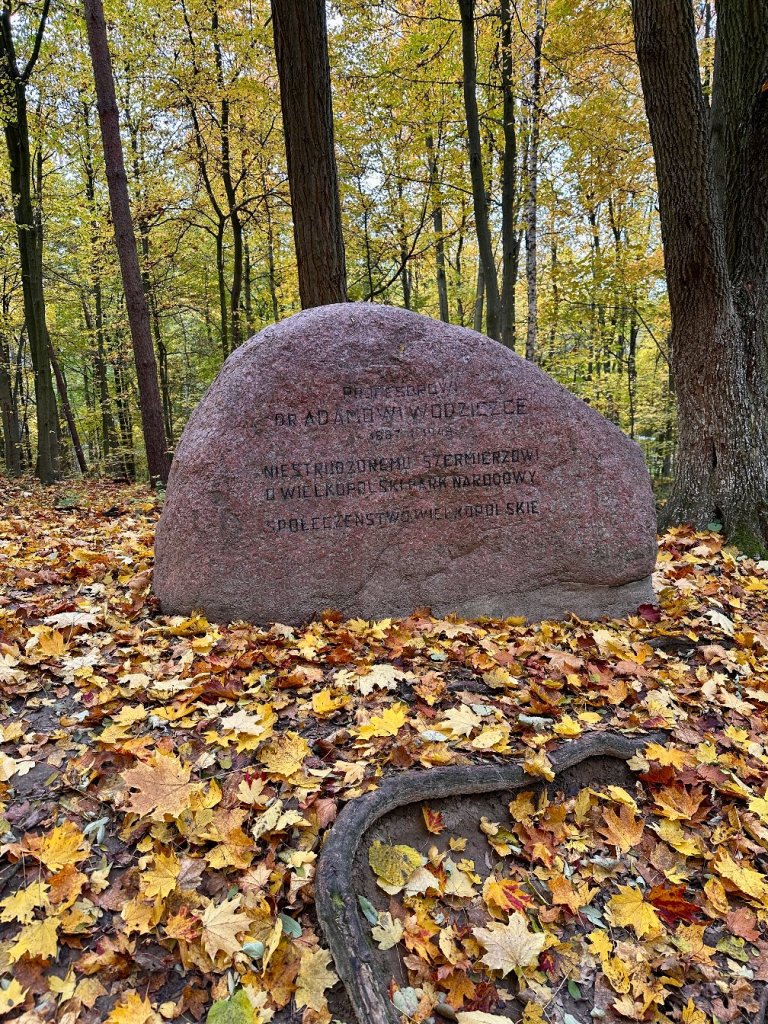 Tu znajduje się pomnik Zamoyskiego – kamień pamiątkowy, a wzdłuż trasy małe tabliczki z nazwami zwierząt i roślin.Wiatr szarpie liście, kolory lasu migoczą w odcieniach żółci i zieleni.