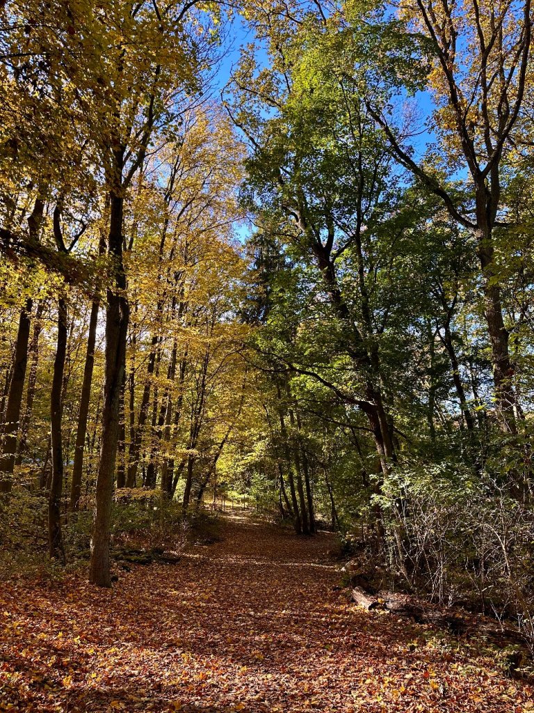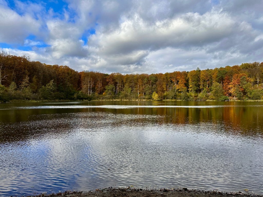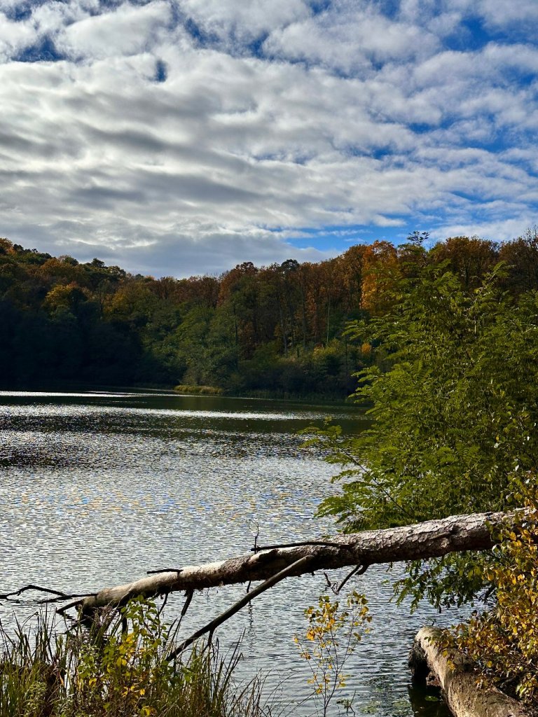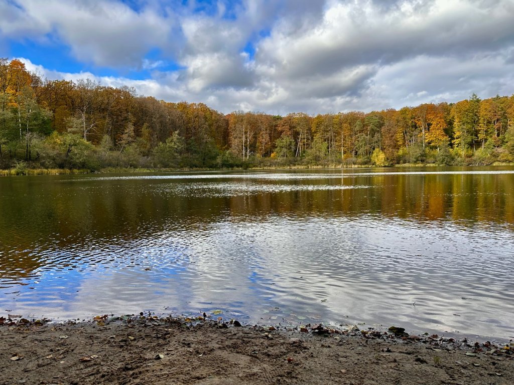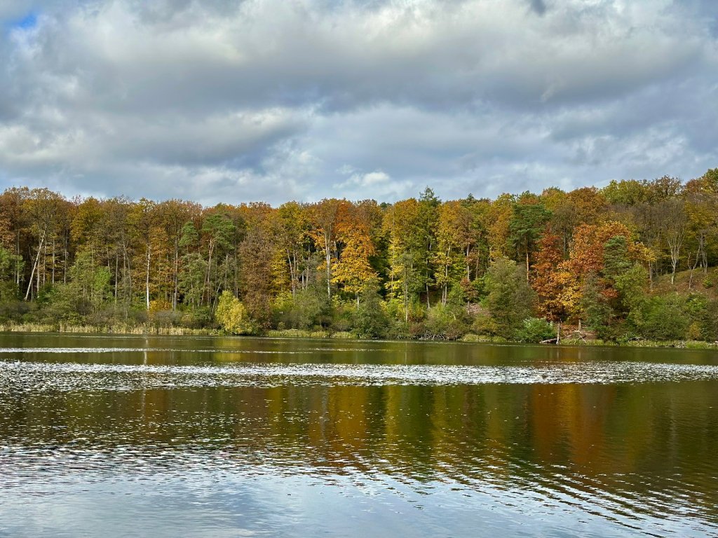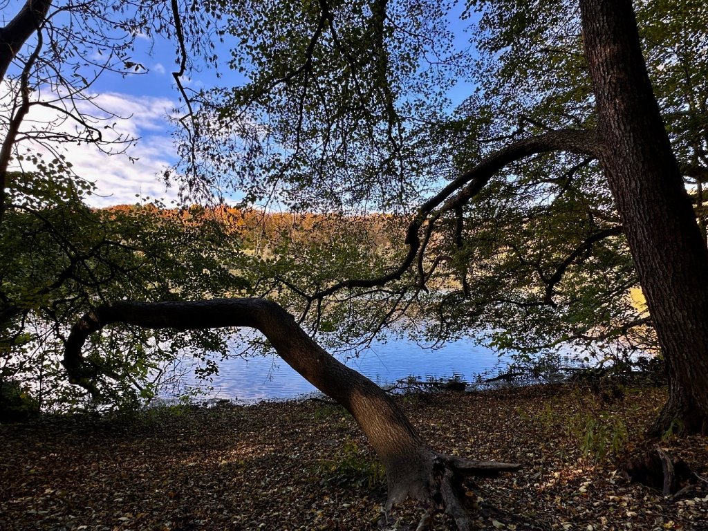 Wiatr przybiera na sile, liście lecą z drzew jak konfetti. Wracamy tą samą drogą do parkingu, po drodze schodząc jeszcze na chwilę nad jezioro – tylko przez przesmyk między drzewami, by zrobić ostatnie zdjęcie.