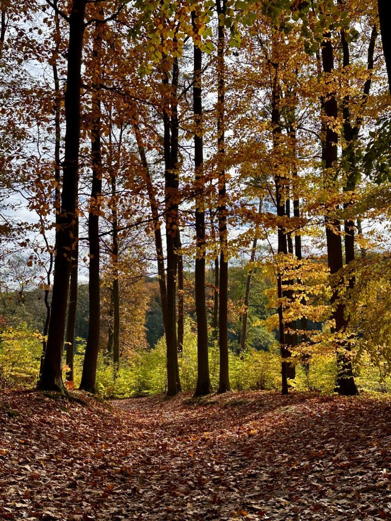 Wchodzimy w gęstszy las – liście tworzą miękki dywan pod stopami, a wiatr hula w gałęziach.