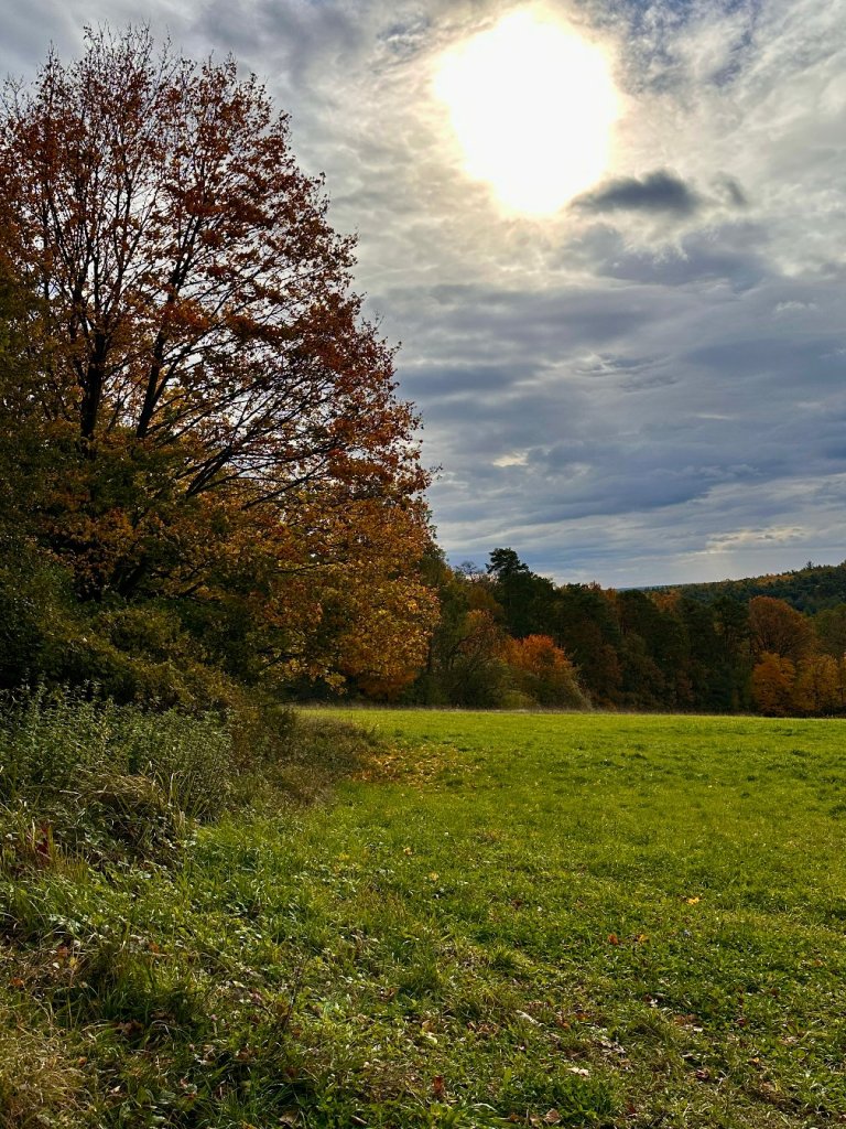 - Słońce przebijające przez chmury i kolory jesieni w pełni.