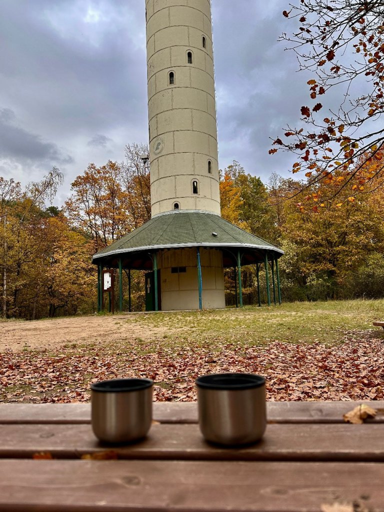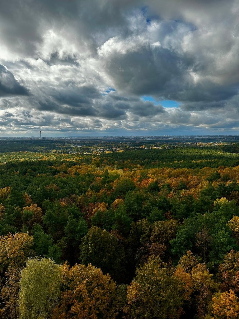 Pod wieżą robimy przerwę na kawę z termosu, obserwując słońce, które walczy z nadciągającymi chmurami. W lesie pojawia się coraz więcej ludzi – rodziny z dziećmi, spacerowicze z psami, rowerzyści i biegacze.