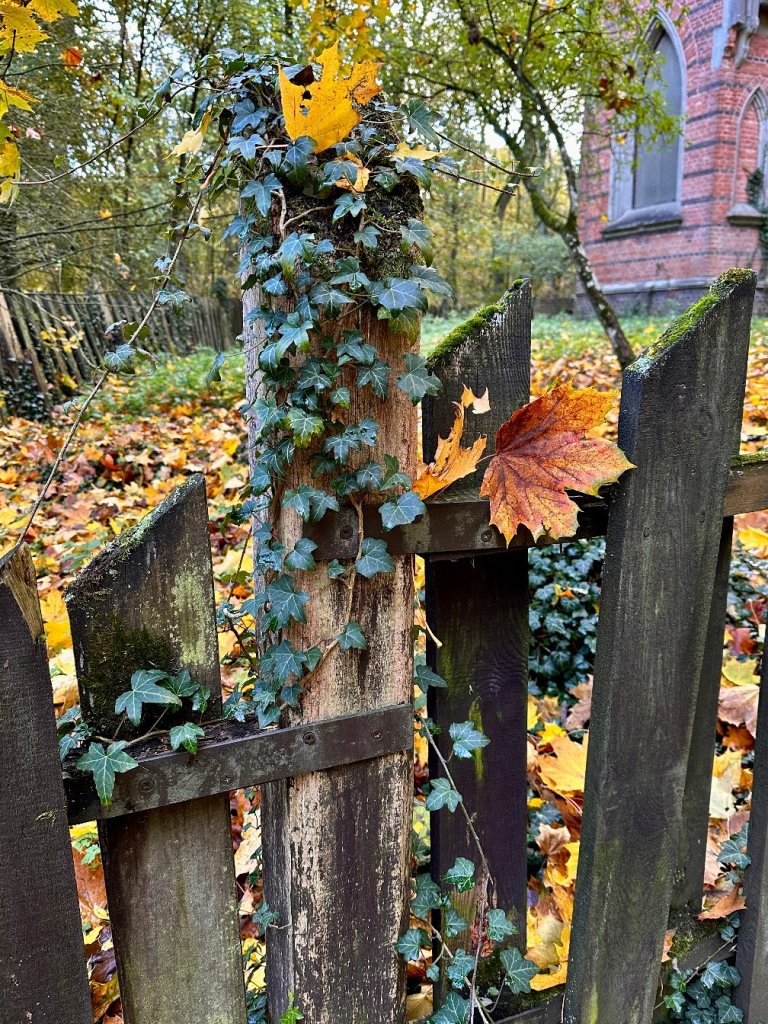 Ogrodzenie wokół mauzoleum jest nieco omszałe i porośnięte bluszczem, co dodaje miejscu tajemniczości.