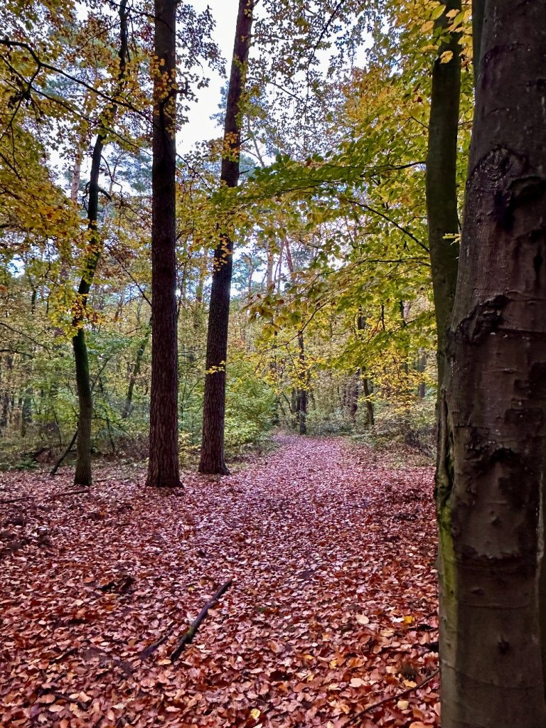 Idziemy w dół – las cichnie, pod nogami mając dywan z czerwonawych liści.