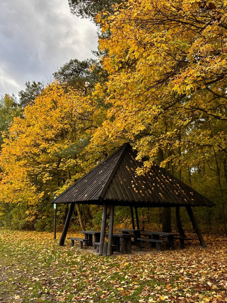 Wychodzimy na szeroką, leśną drogę. Obok znajduje się wiata piknikowa i kilka tablic informacyjnych ustawionych blisko siebie. W oddali słychać ptaki, a powietrze jest chłodne i przejrzyste.