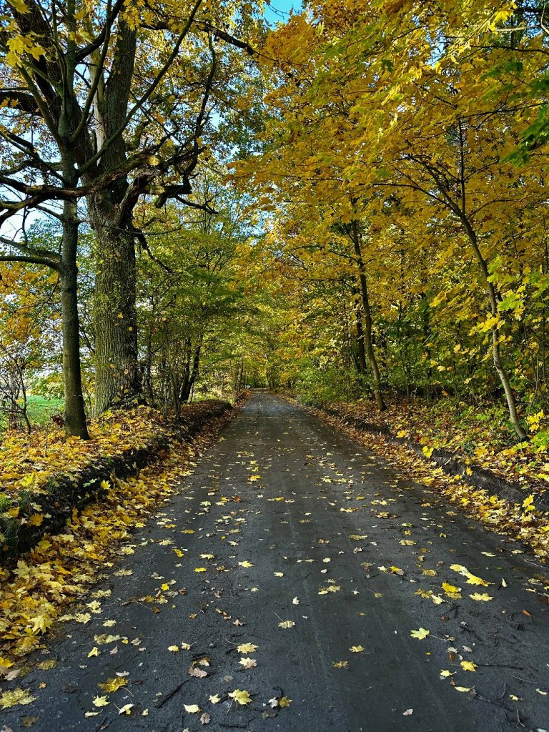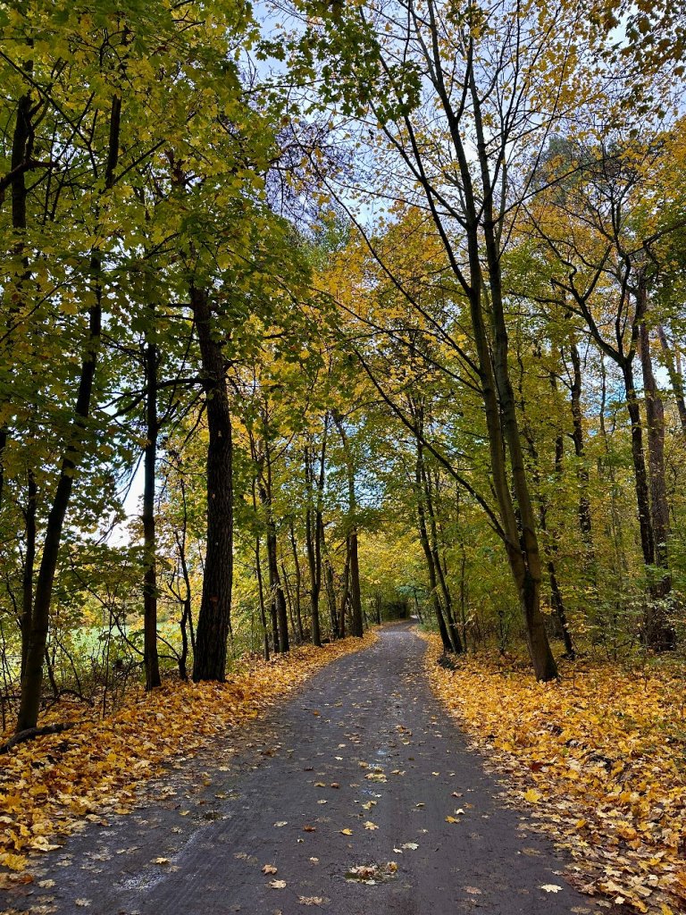 Złote promienie słońca wpadają między drzewa, podświetlając żółte liście. W lesie pachnie jesienią, ziemią i mokrymi liścmi.