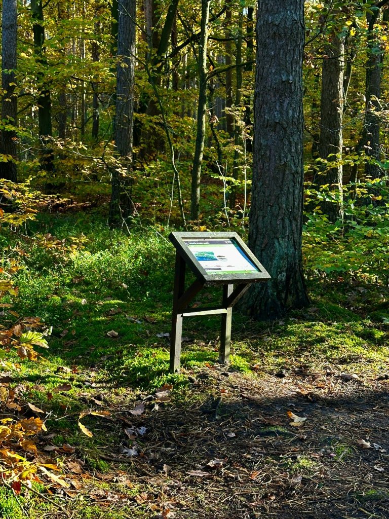 Tabliczka znajduje się nieco dalej, w przeciwną stronę niż muzeum, za parkingiem przy wejściu do Wielkopolskiego Parku Narodowego. Czytamy o głazach narzutowych, które pozostały po epoce lodowcowej.