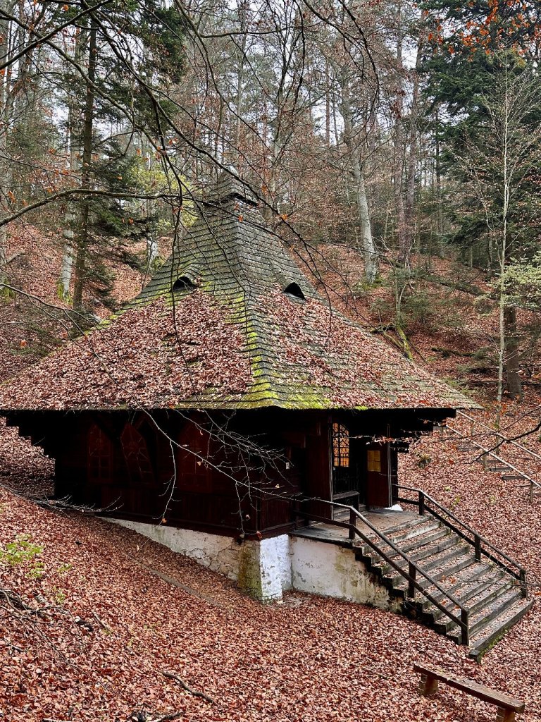 To niewielka, drewniana budowla, tego dnia otwarta, ale zabezpieczona kratą. Wokół niej roztacza się widok na wzniesienie z którego przyszliśmy, a w dolinie wyróżnia się zieleń pokrzyw, które przetrwały jeszcze między pomarańczowym dywanem jesieni.