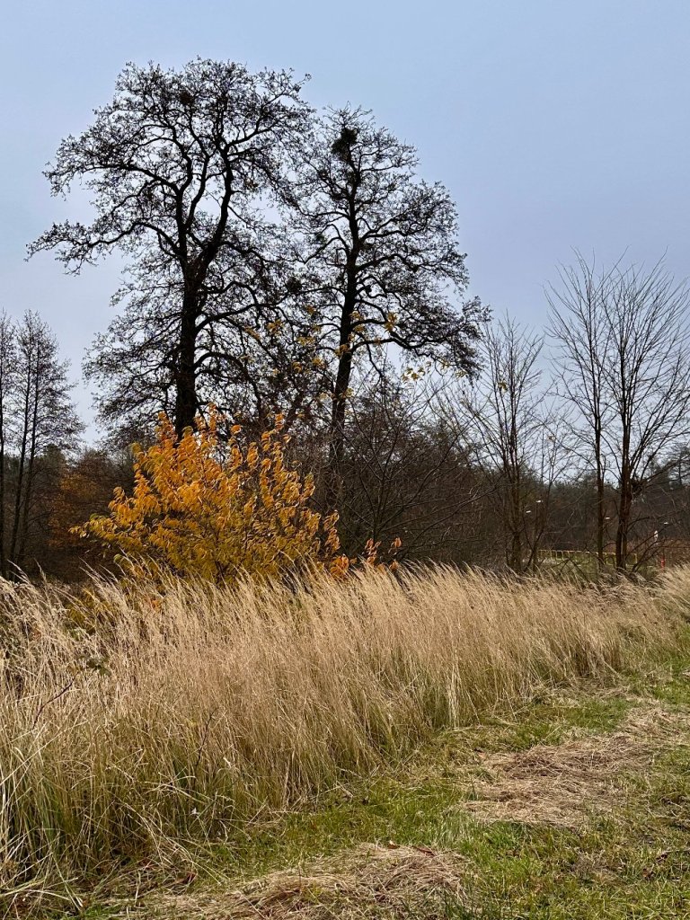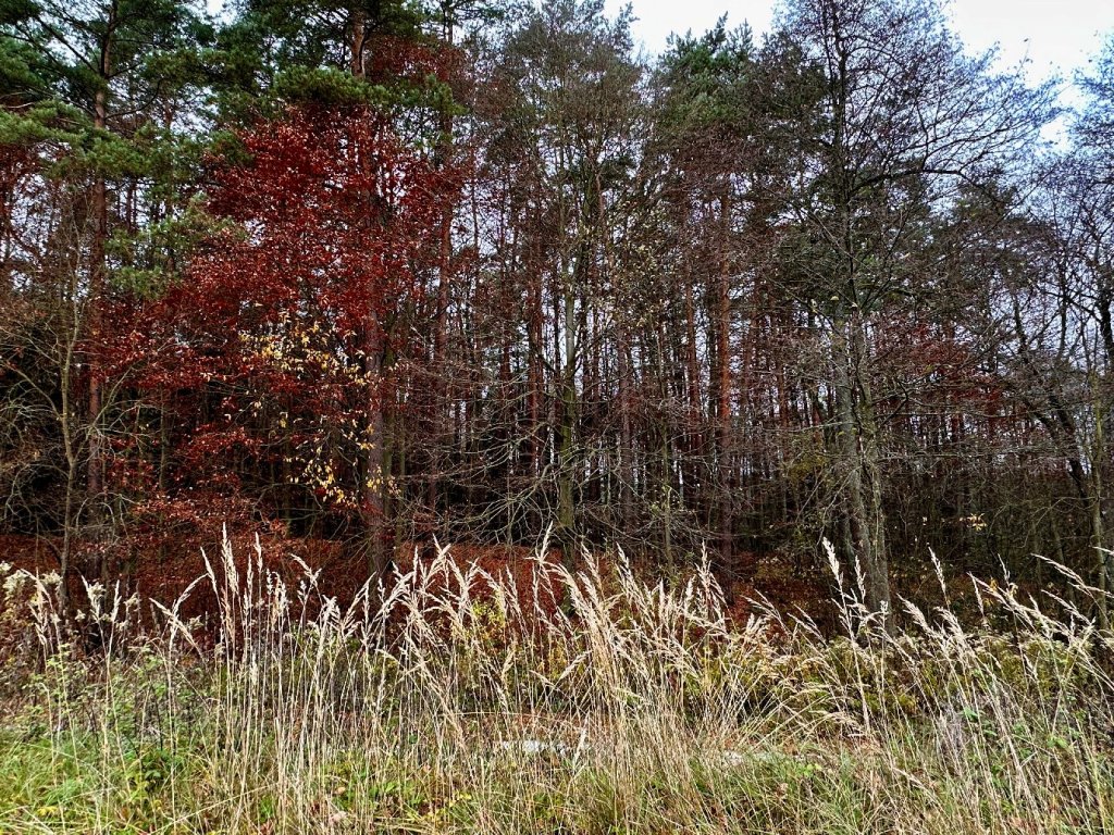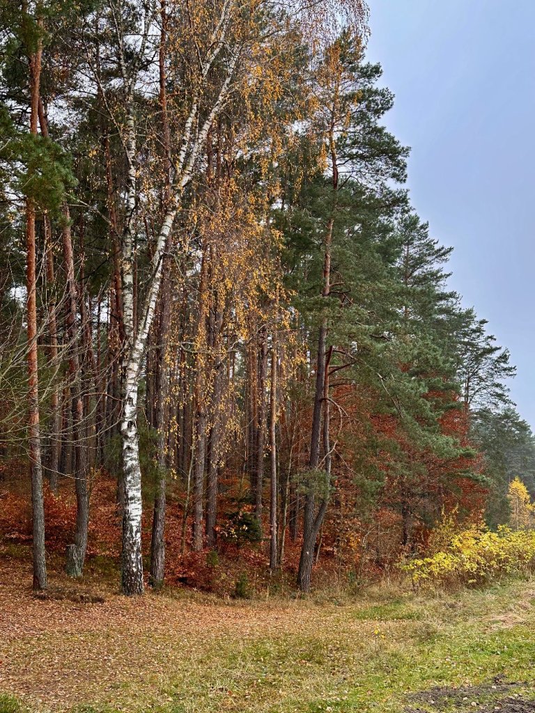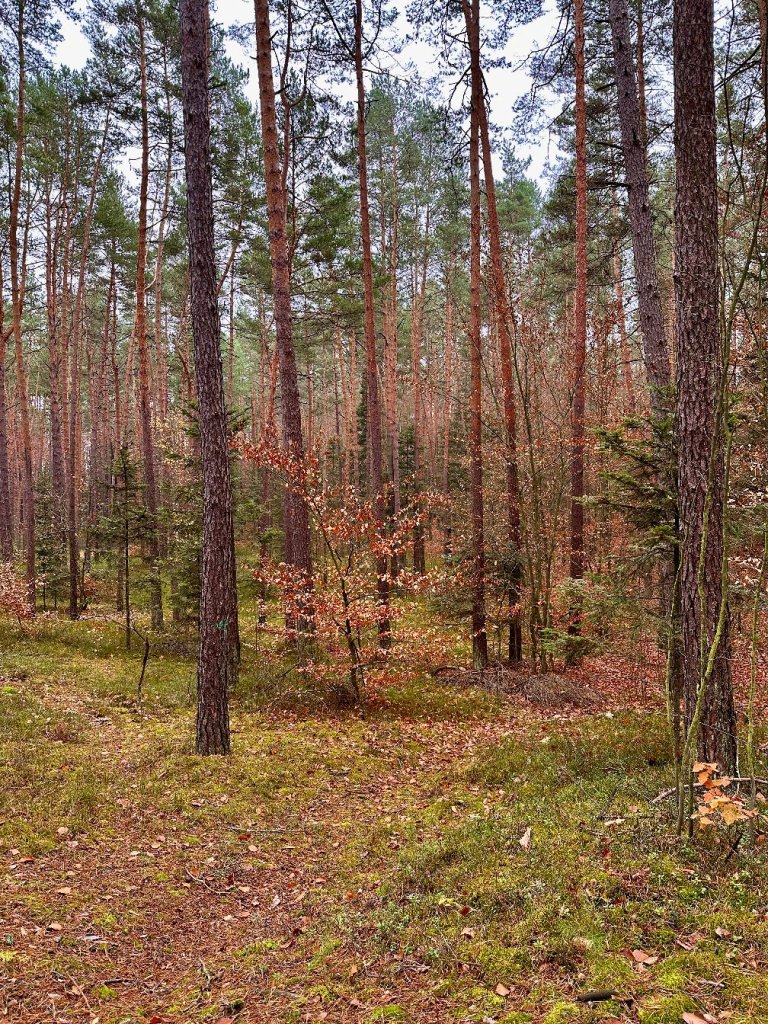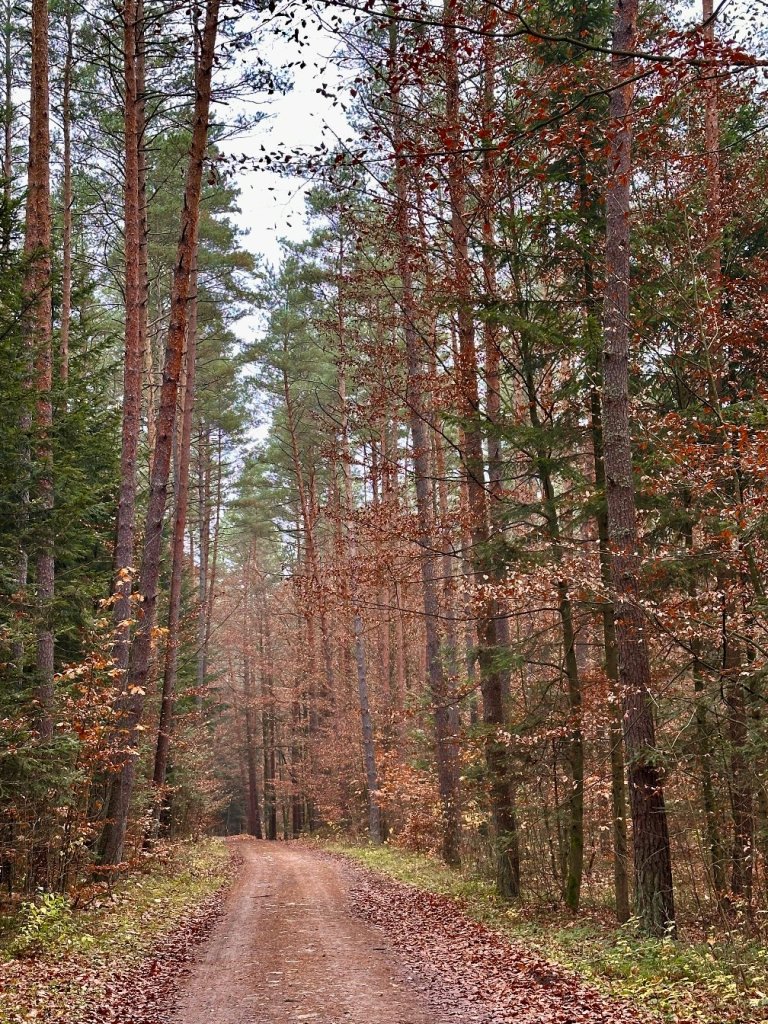 Po drugiej stronie ulicy wchodzimy ponownie w las, tu ściółka jest bardziej zielona i miękka, jakby jeszcze nie poddała się listopadowi.