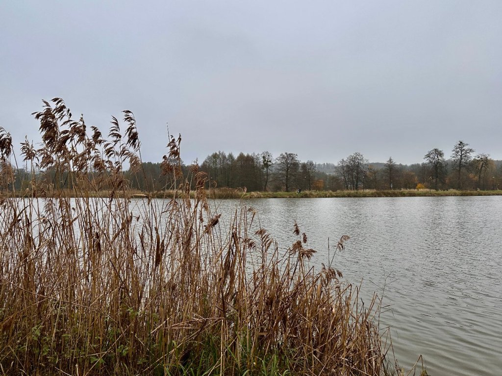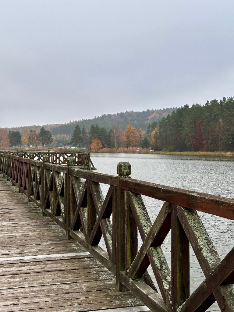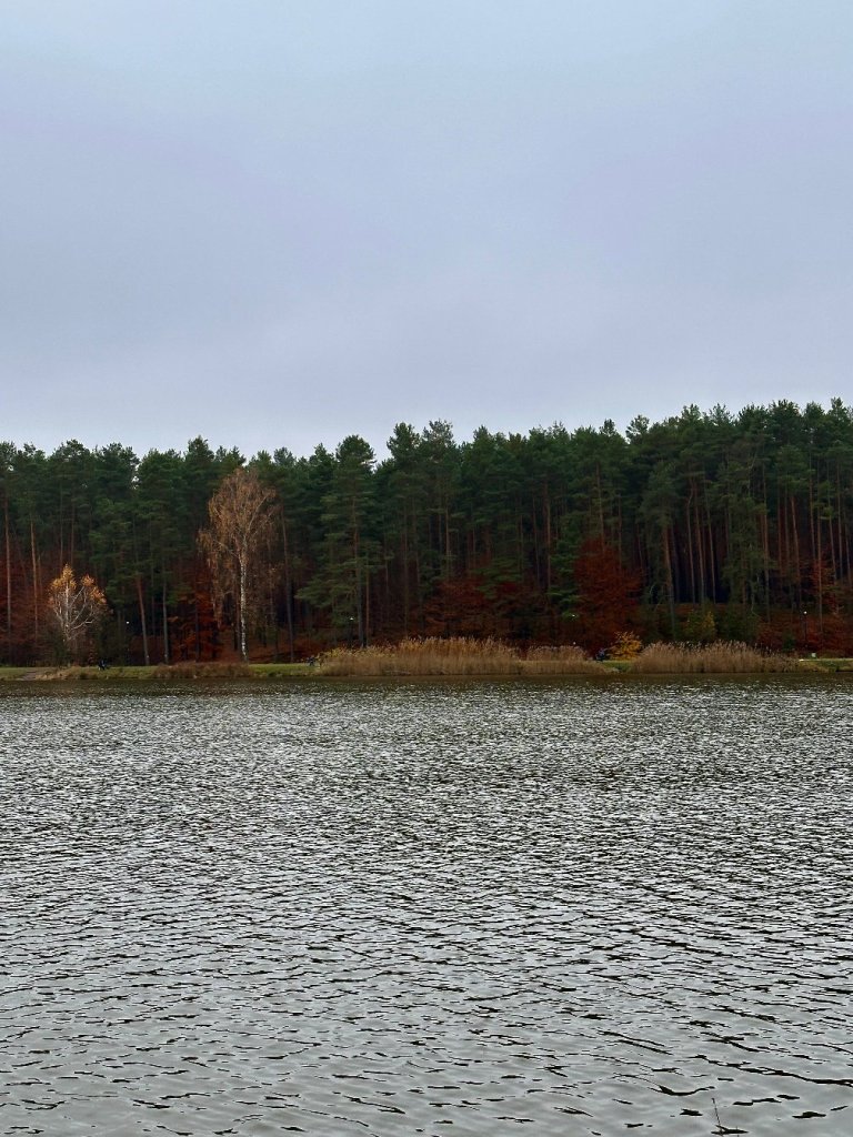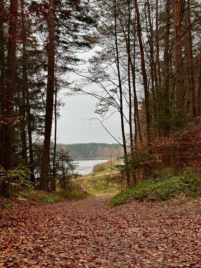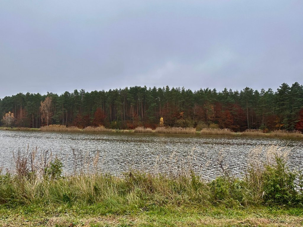 Idziemy wzdłuż brzegu, mijając kilku wędkarzy i paru spacerowiczów. Po lewej stronie towarzyszy nam las pełen zielonych sosen, poprzetykanych resztkami czerwieniejących liści.